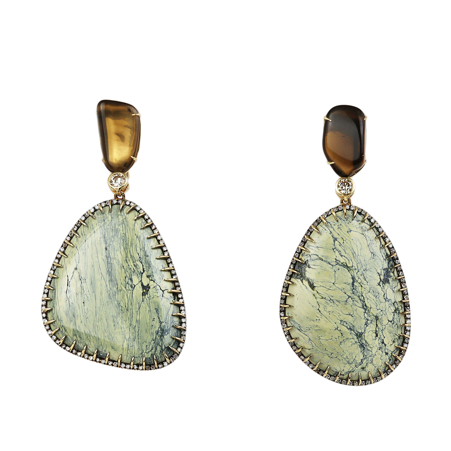 14k yellow gold dangle earrings with turquoise, smokey quartz, and diamonds which amount to approximately 0.72 carat TW (I1 clarity/H-I-J color). They measure 56mm tall, 27mm at the widest, and total weight is 23.5 grams.