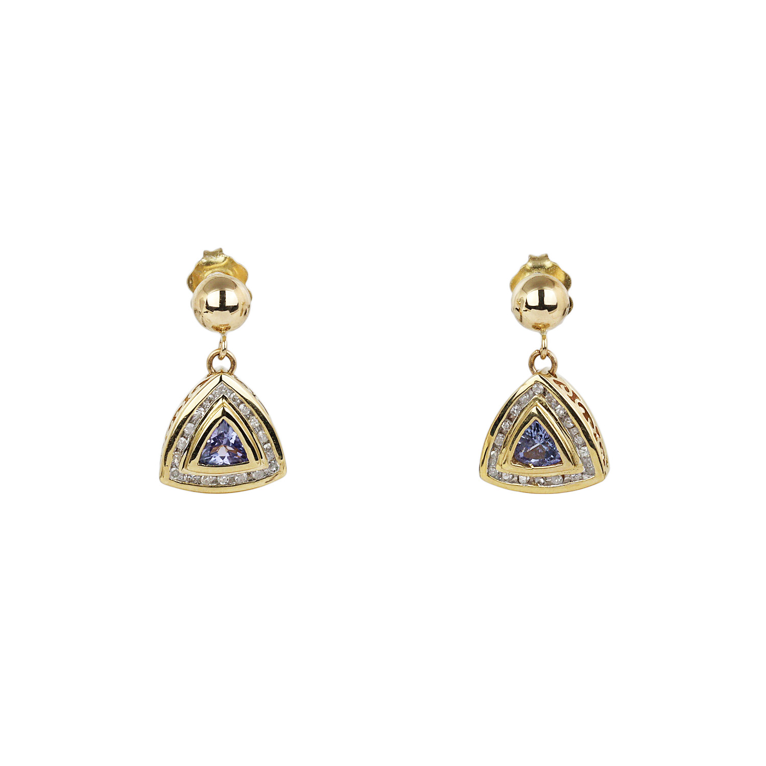 14k yellow gold earrings with tanzanite stones and diamonds which amount to approximately 0.20 carat TW (I1 clarity/G-H-I color). They measure 18mm tall, 11mm at the widest, and total weight is 4.1 grams.