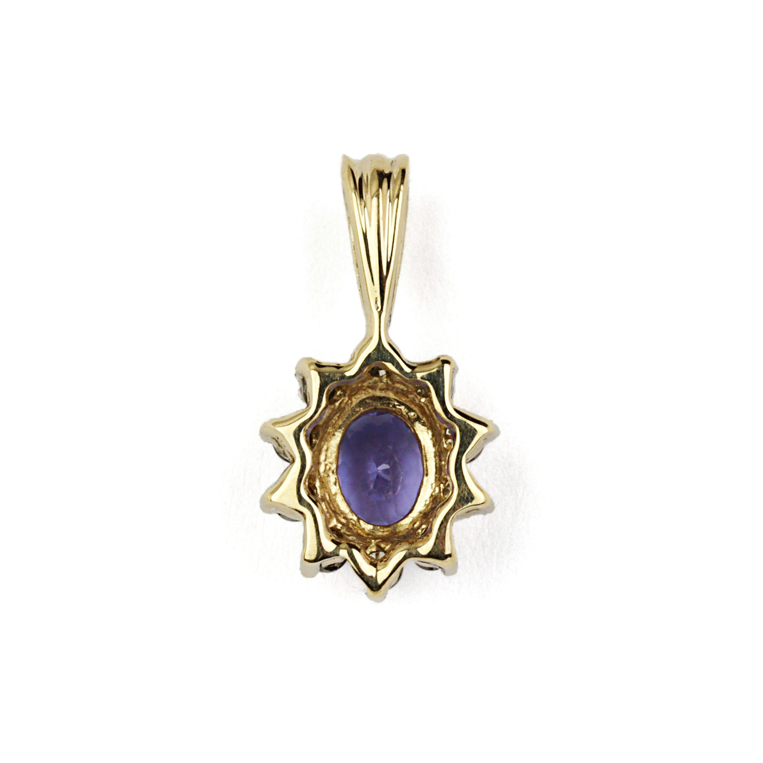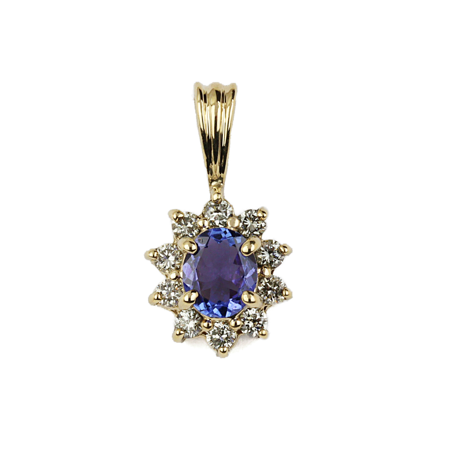 14k yellow gold pendant with a 6mm by 5mm tanzanite stone and diamonds which amount to approximately 0.25 carat TW (SI2-I1 clarity/J-K-L color). It measures 18mm tall, 10mm wide, fits a 2mm chain, and weighs 1.6 grams.