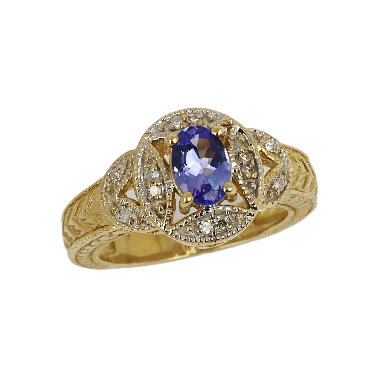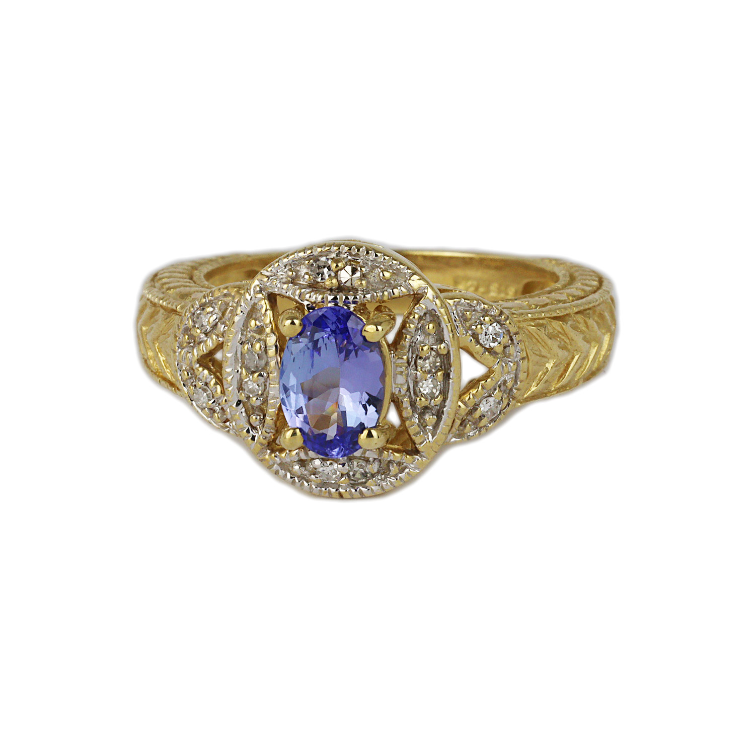 14k yellow gold ring with a tanzanite stone and diamonds which amount to approximately 0.04 carat TW (I1 clarity/G-H-I color). It measures 12mm wide across the top, fits a size 6 finger, and weighs 4.9 grams.