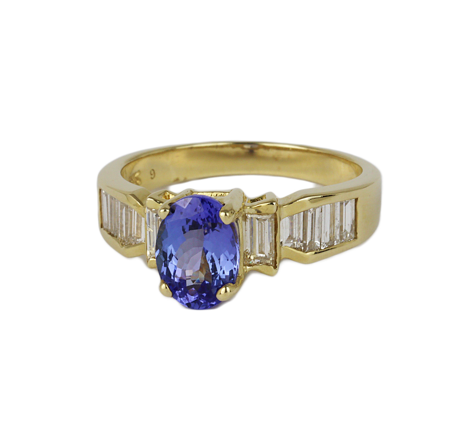 14k yellow gold ring with a tanzanite stone and diamonds which amount to approximately 0.60 carat TW (SI2 clarity/G-H-I color). It measures 8mm wide across the top, fits a size 6.5 grams, and weighs 4.3 grams.