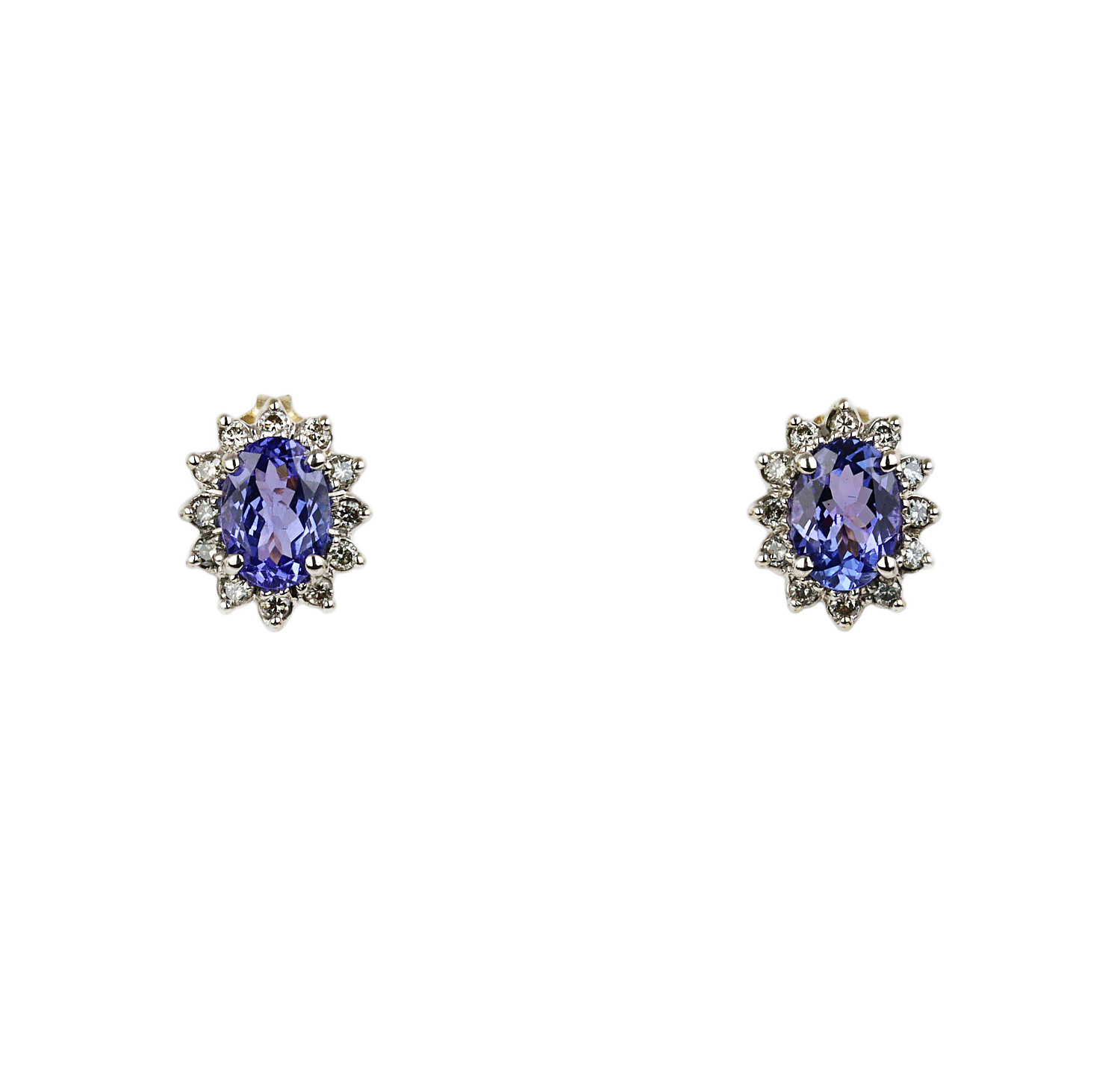 14k yellow gold stud earrings with tanzanite stones and diamonds which amount to approximately 0.22 carat TW (SI1-I1 clarity/I-J-K color). They measure 11mm tall, 9mm wide, and total weight is 2.7 grams.