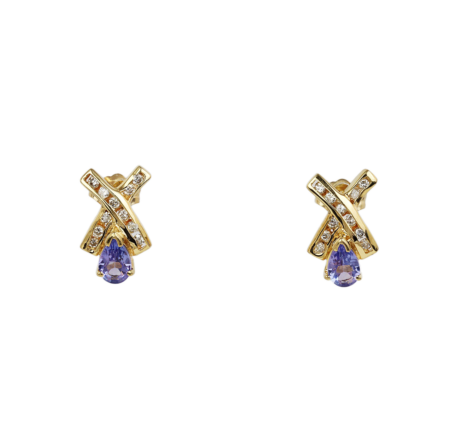 14k yellow gold stud earrings with tanzanite stones and diamonds which amount to approximately 0.25 carat TW (SI2-I1 clarity/G-H-I color). They measure 14mm tall, 9mm wide, and total weight is 3.0 grams.
