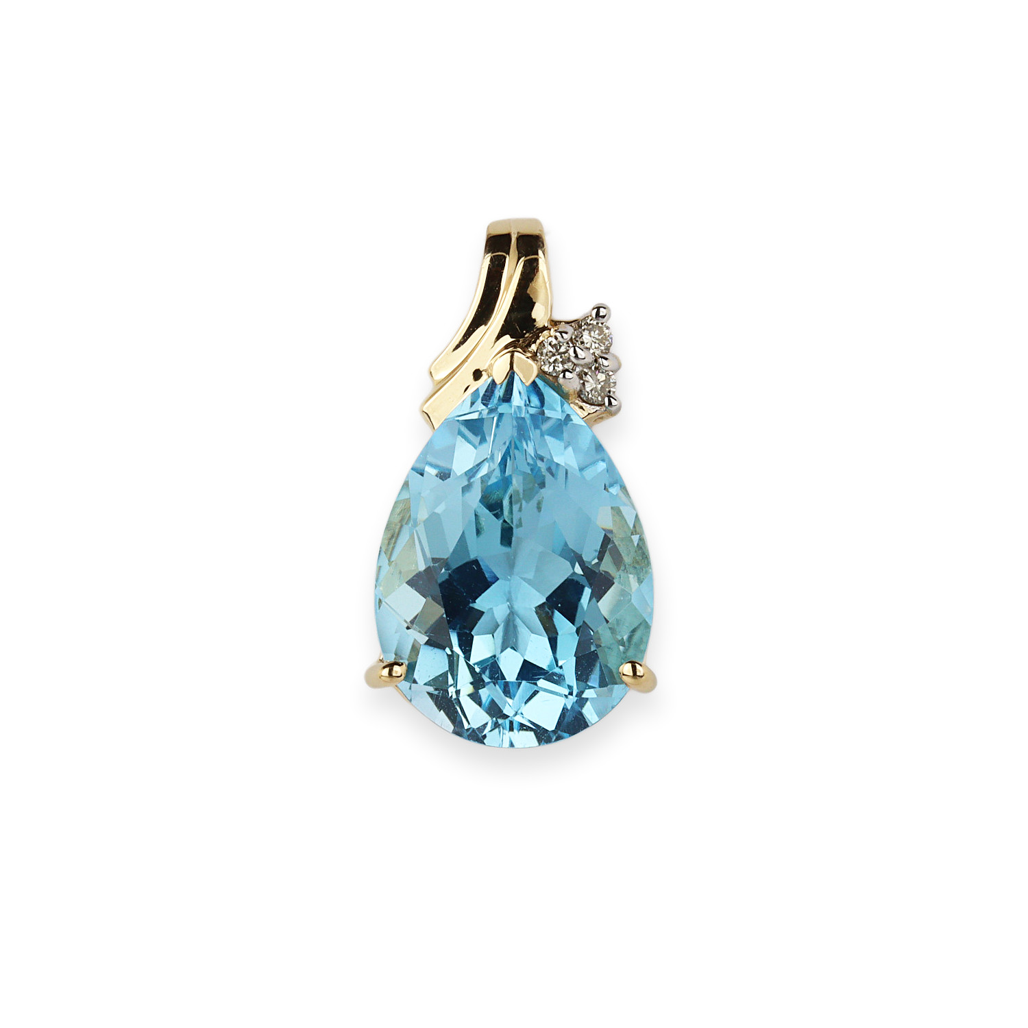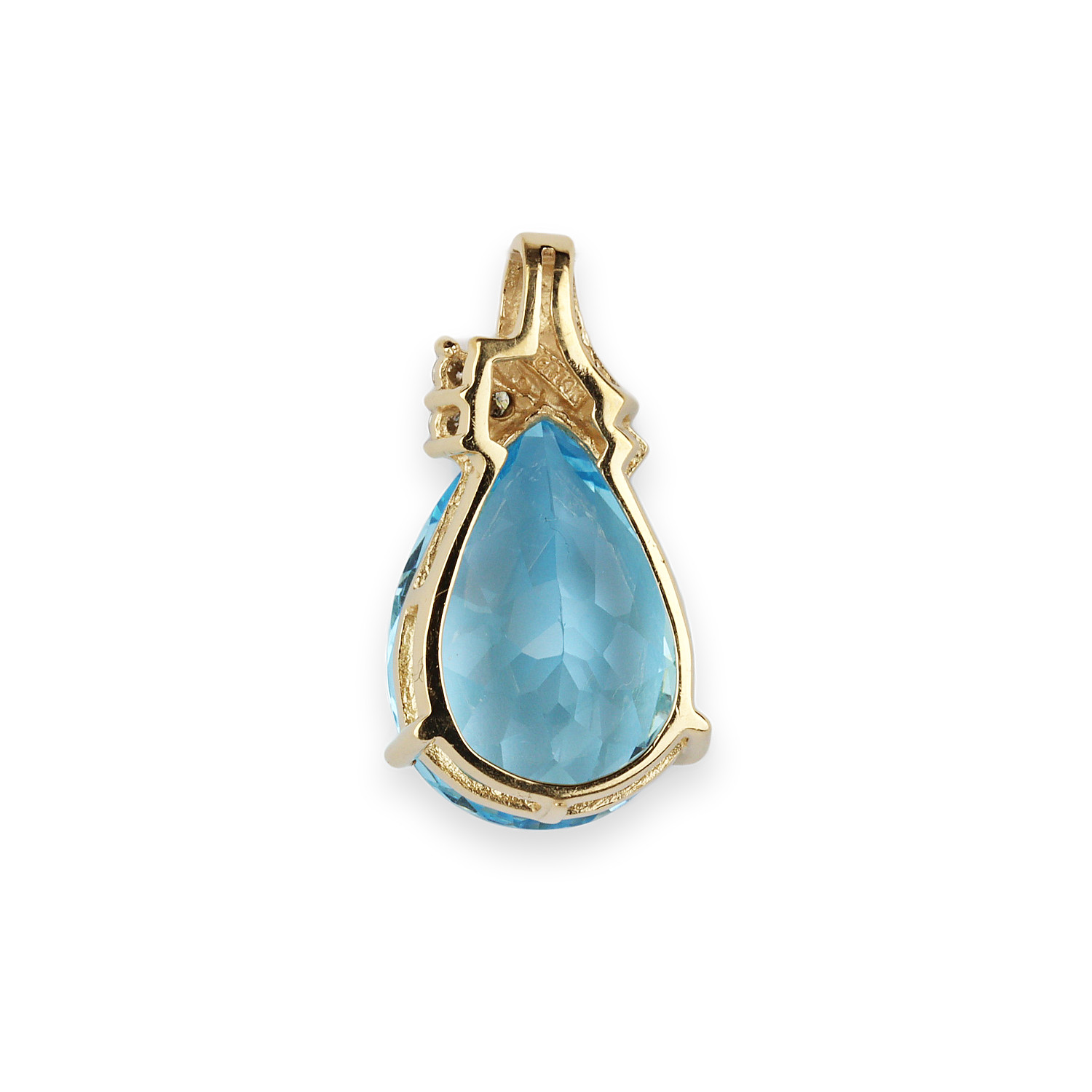 14k yellow gold pendant with a 13mm by 18mm blue topaz stone and diamonds which amount to approximately 0.09 carat TW (SI2-I1 clarity/H-I color). It measures 25mm tall, 13mm at the widest, the bail will fit a 2.5mm chain, and weighs 5.1 grams.