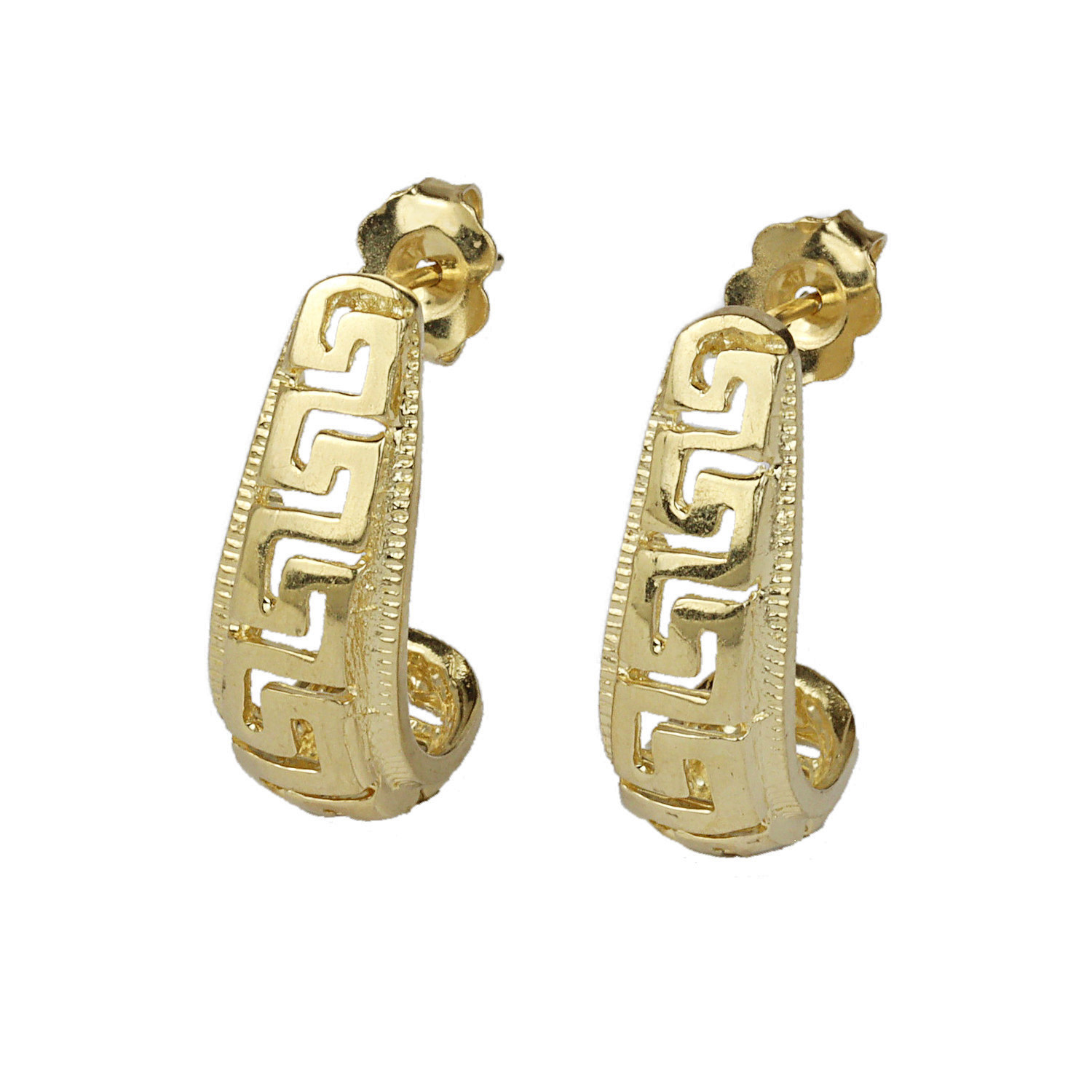 14k yellow gold Greek key stud earrings. They measure 20mm tall, 7mm at the widest, and total weight is 3.6 grams.