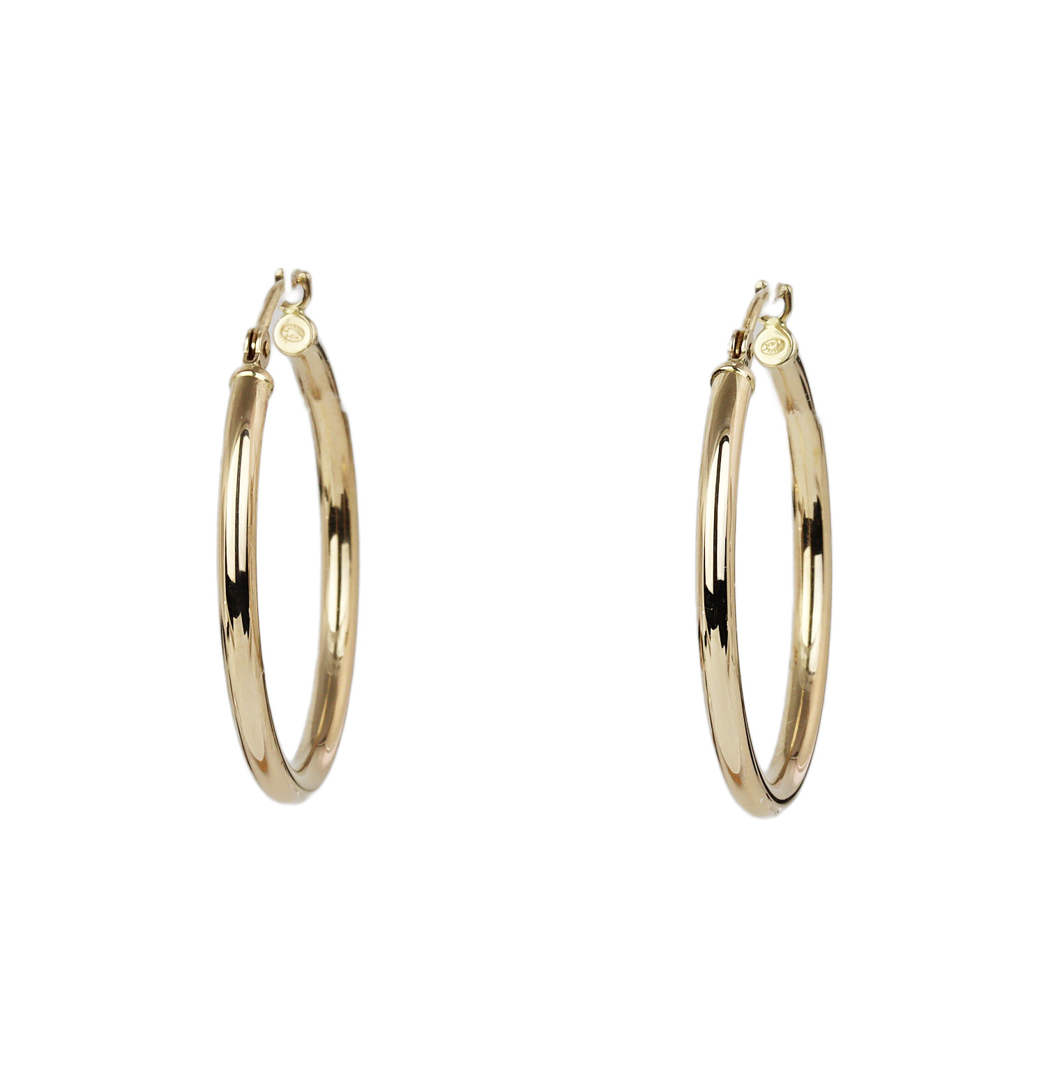14k yellow gold earrings. They measure 25mm in diameter and total weight is 1.1 grams.