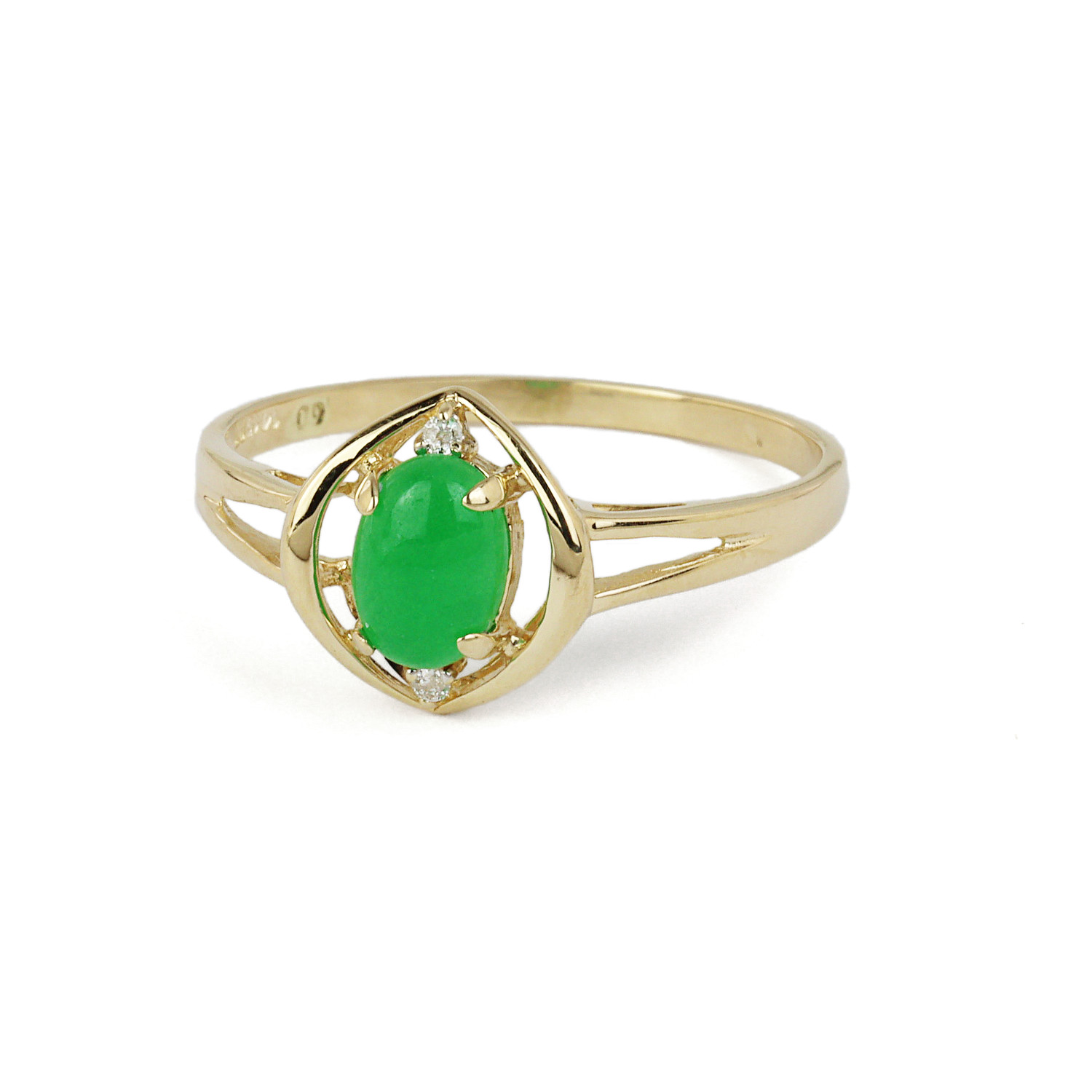 14k yellow gold ring with a 7mm by 5mm green jade stone and diamond accents which amount to approximately 0.02 carat TW (I1-I2 clarity/G-H-I color). Fits a size 9 finger, measures 10mm wide across the top, and weighs 2.0 grams.