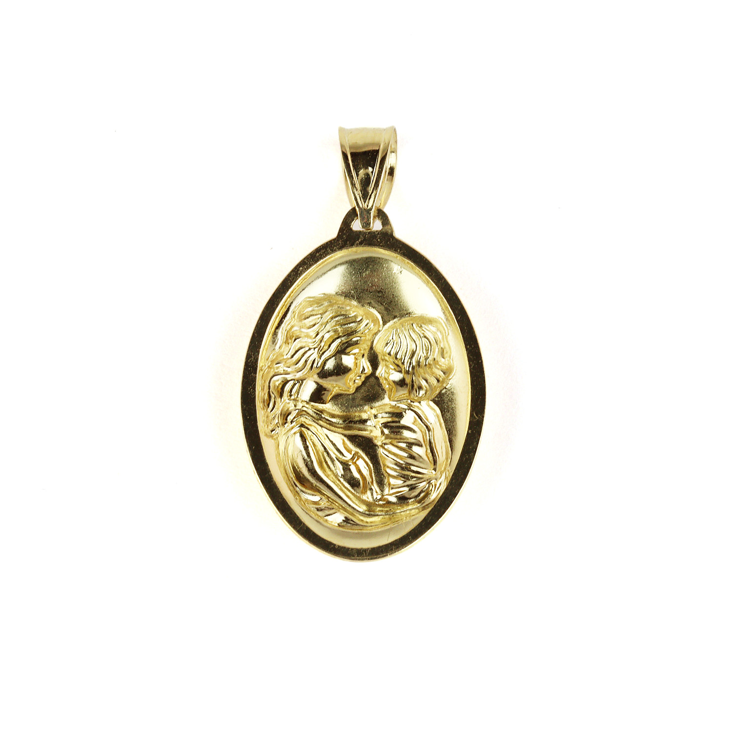 14k yellow gold pendant featuring a mother and child. It measures 34mm tall, 18mm wide, the bail will fit a 4mm chain, and weighs 1.5 grams.