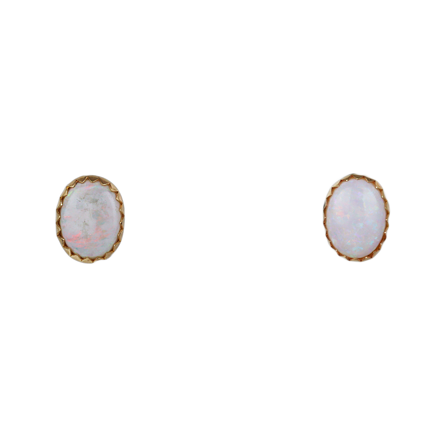 14k yellow gold stud earrings with opal stones. They measure 9mm tall, 7mm wide, and total weight is 1.1 grams.