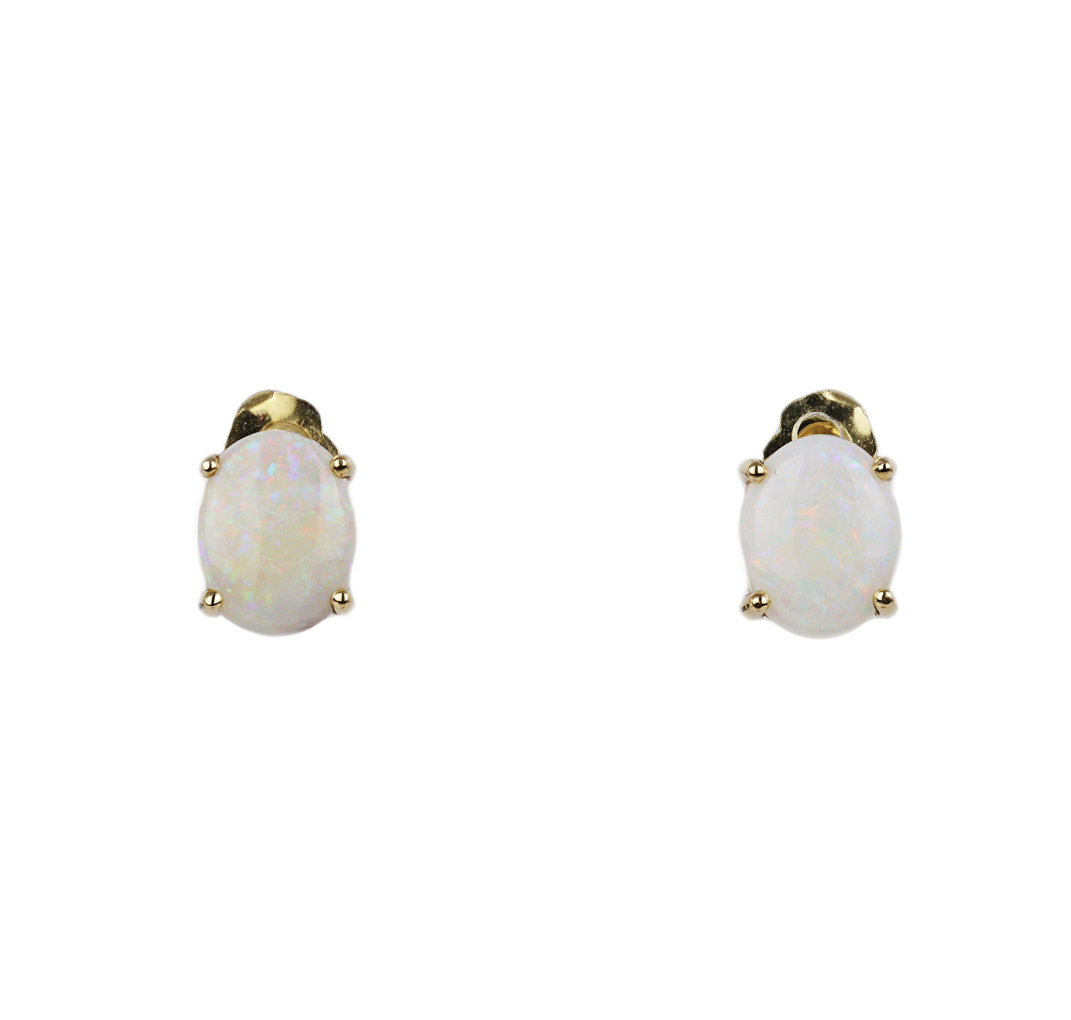 14k yellow gold stud earrings with opal stones. They measure 10mm tall, 8mm wide, and total weight is 2.3 grams.