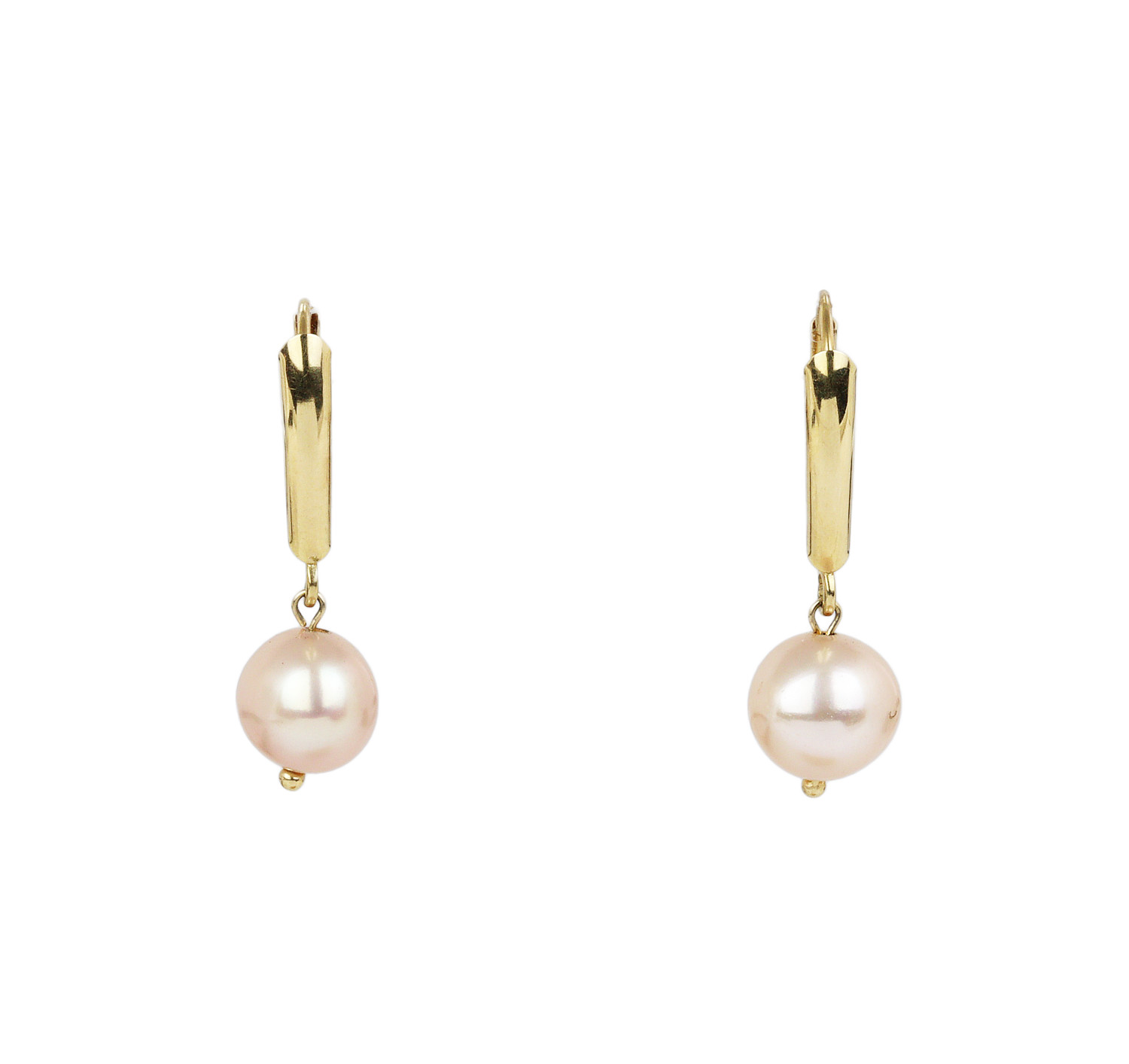 14k yellow gold earrings with cultured pearls. They measure 25mm tall, 8mm wide, and total weight is 2.1 grams.