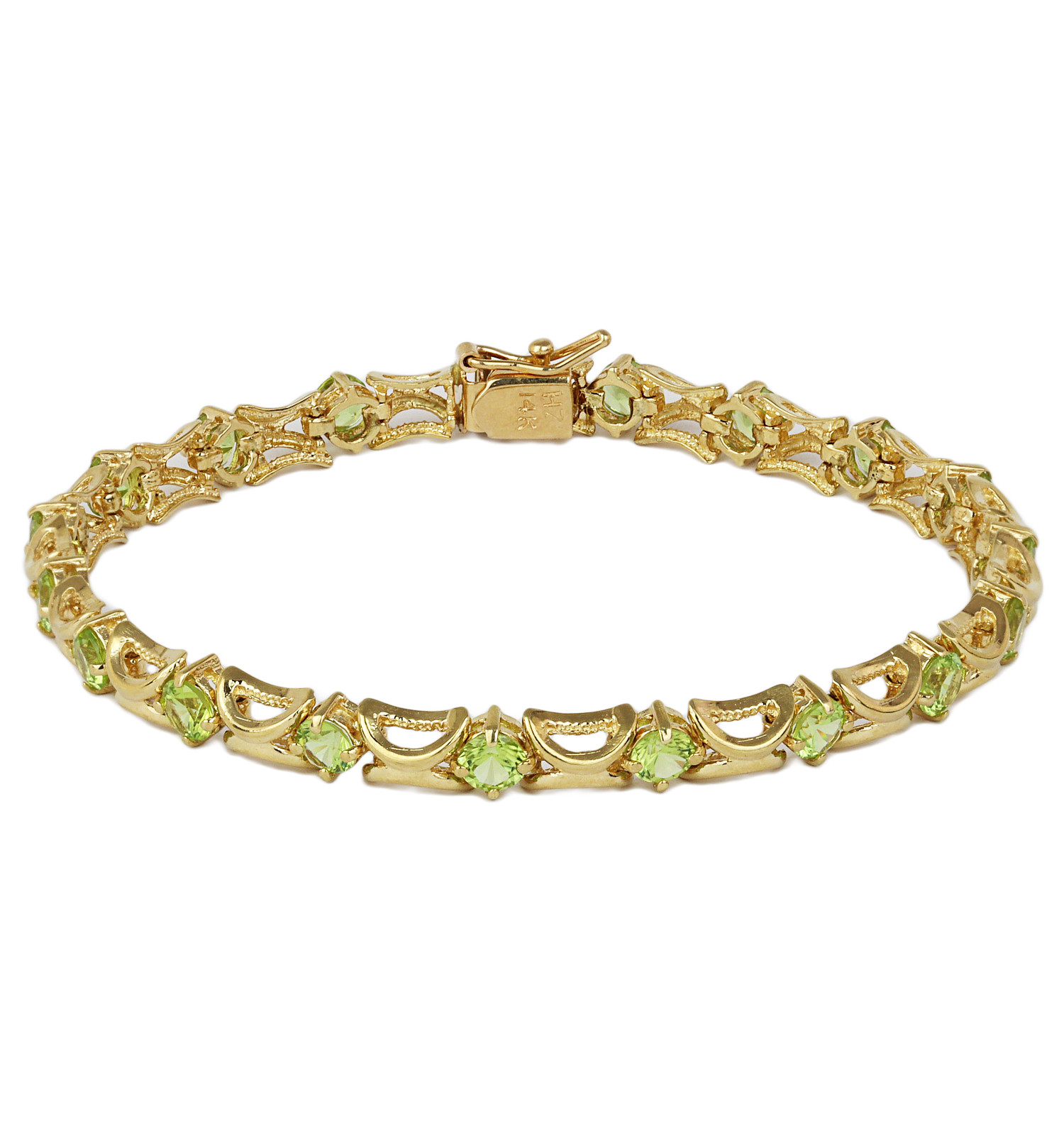 14k yellow gold bracelet with peridot stones. It measures 7″ long, 5.5mm wide, and weighs 10.7 grams.