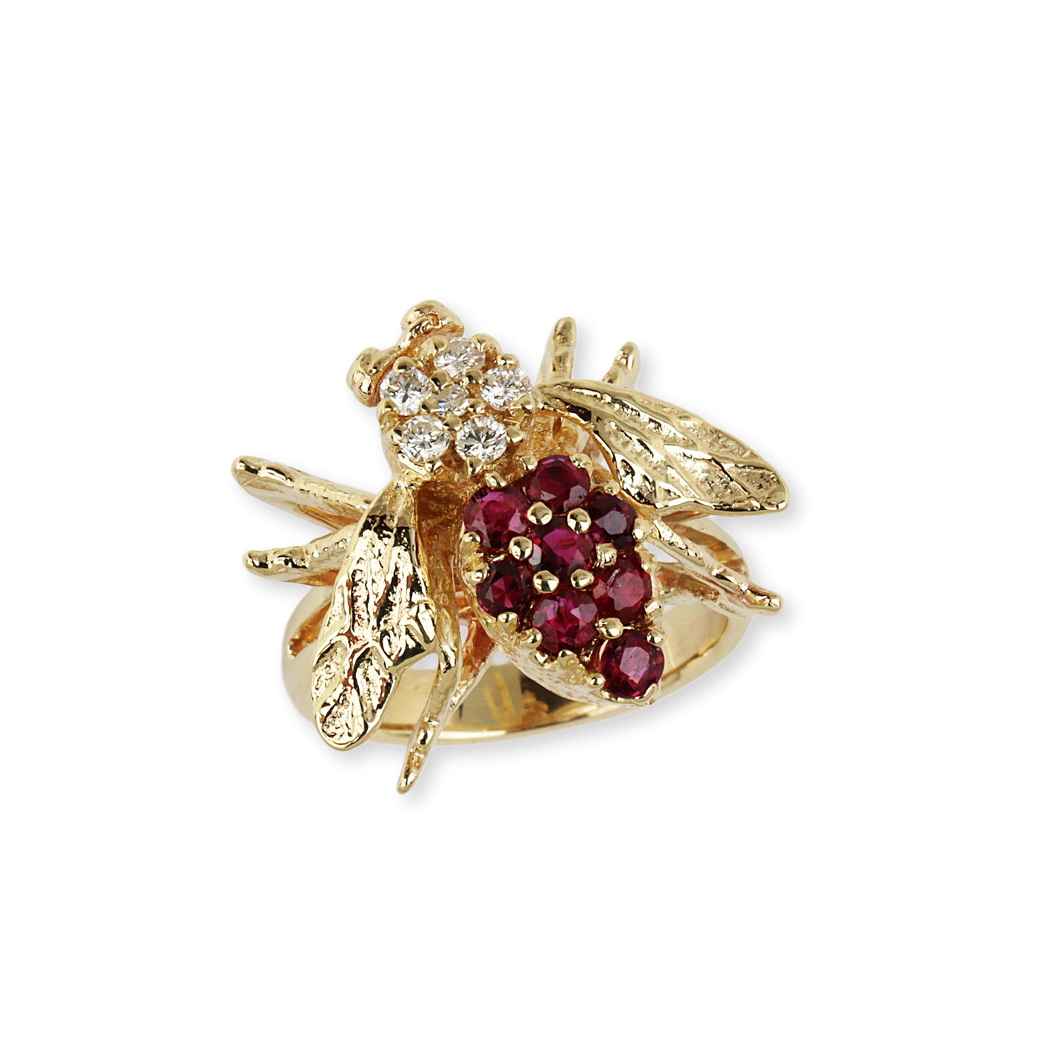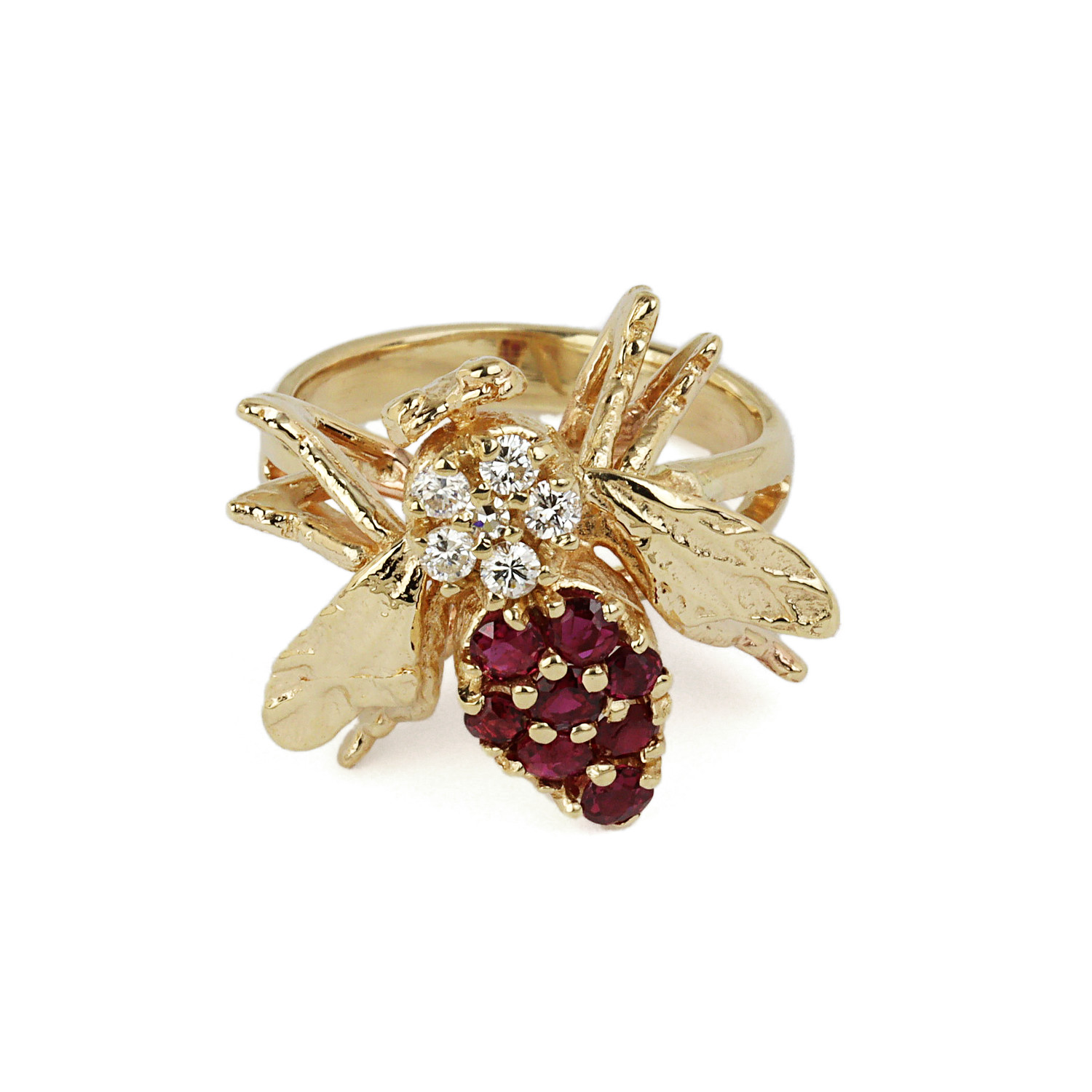 14k yellow gold ring with diamonds which amount amount to approximately 0.17 carat TW (VS2-I1 clarity/H-I-J color) and 2mm diameter ruby stones. Fits a size 5.75 finger, measures 19mm wide across the top, and weighs 7.9 grams.