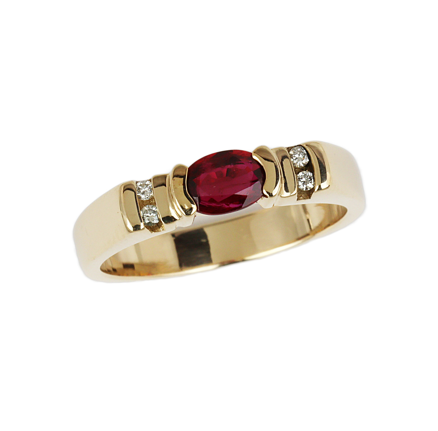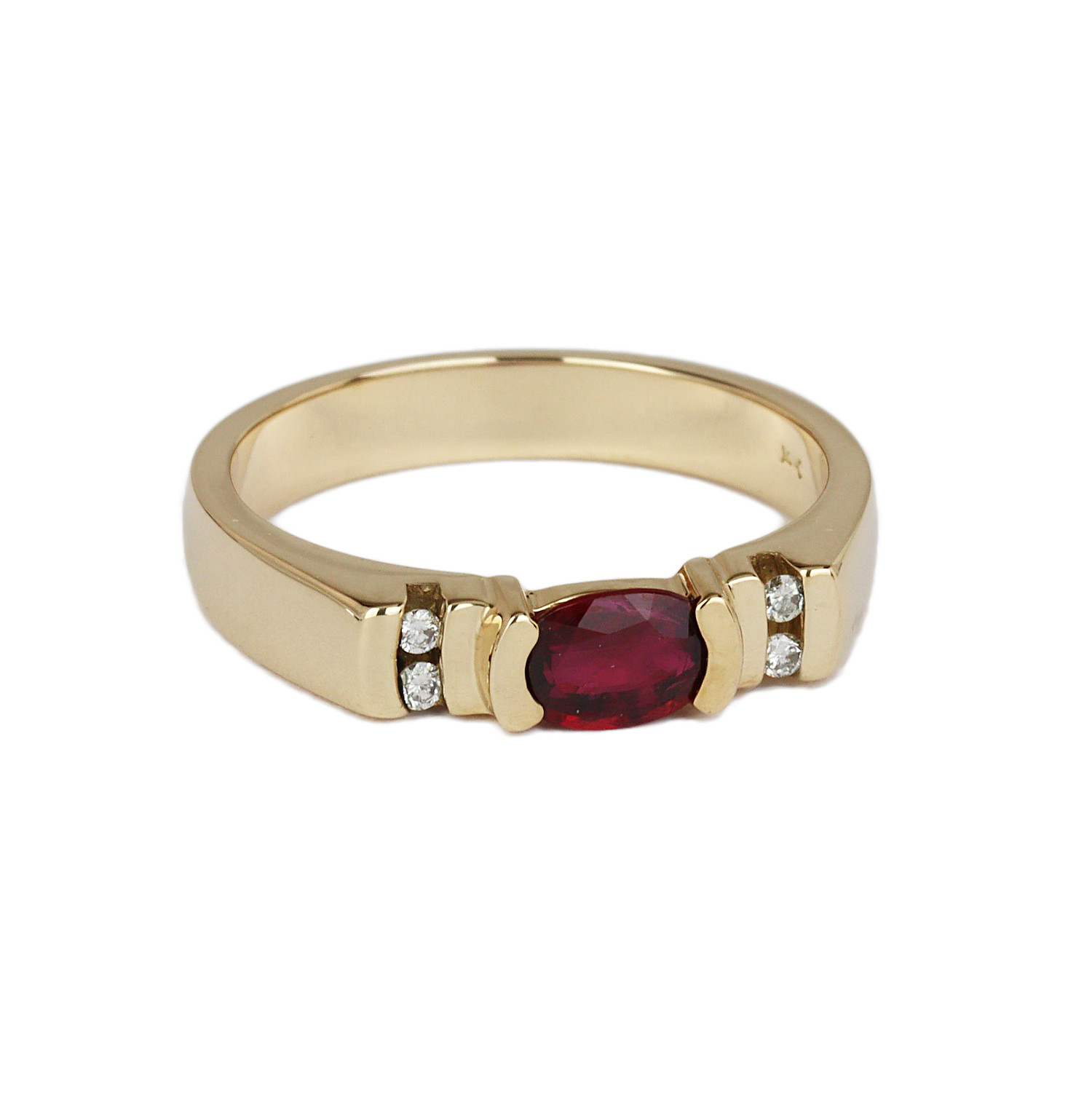 14k yellow gold ring with a 4mm by 5mmm natural ruby and diamond accents which amount to approximately 0.05 carat TW (VS1 clarity/G-H-I color). Fits a size 6 finger, measures 4mm wide across the top, and weighs 4.0 grams.