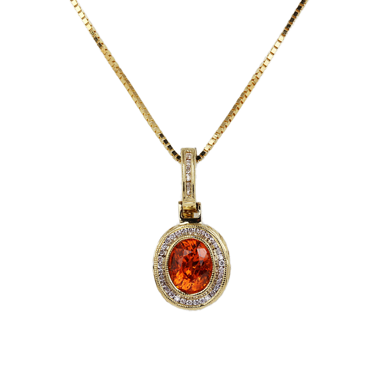 14k yellow gold necklace with an enhancer pendant containing a spessartite garnet surrounded by a diamond halo which amounts to 0.20 carat TW (SI1-I1 clarity/G-H-I color). The box chain is 18″ long, the pendant measures 26mm tall, and total weight is 8.2 grams.