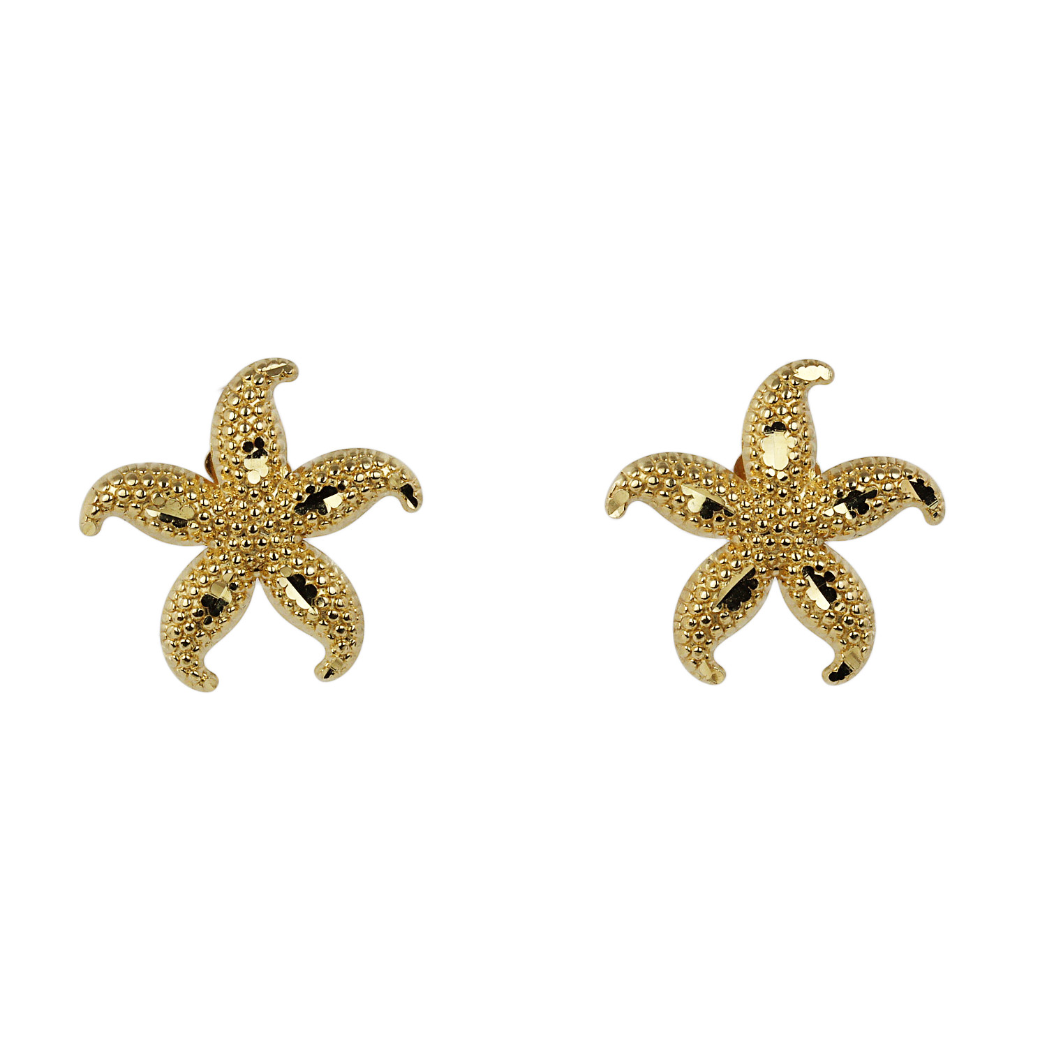 14k yellow gold stud earrings featuring detailed starfish designs. They measure 17mm in diameter and total weight is 3.0 grams.