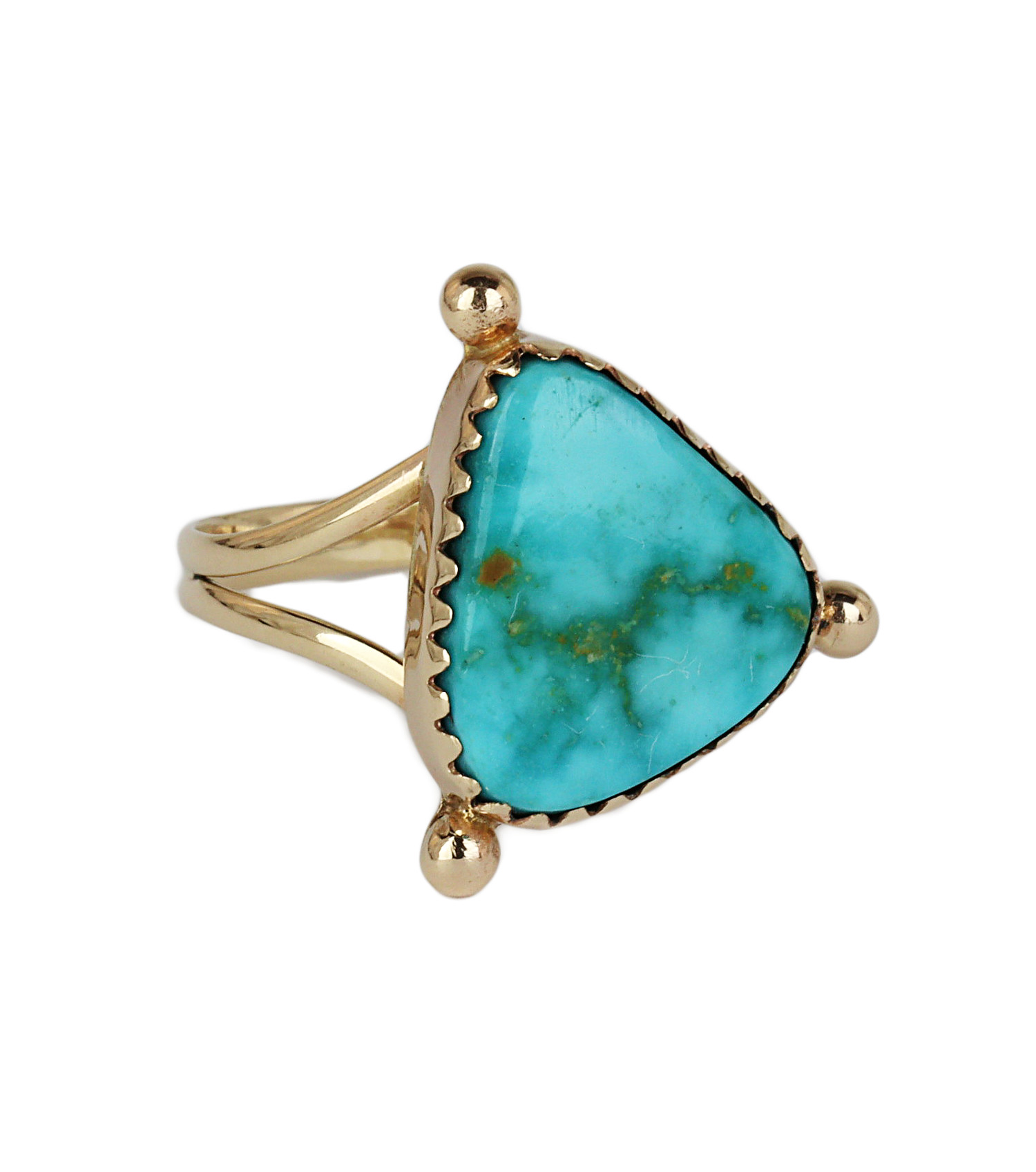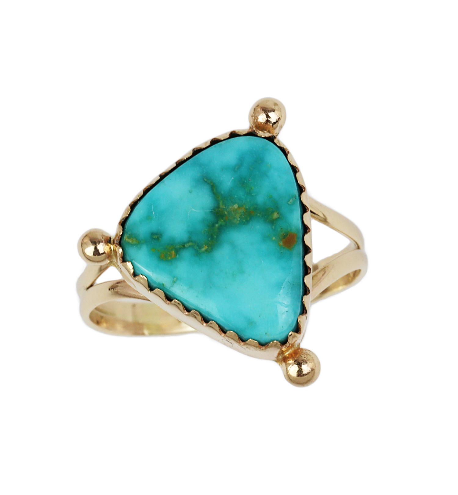14k yellow gold ring with a 12mm by 11mm turquoise stone. Fits a size 5.75 finger, measures 16mm wide across the top, and weighs 2.6 grams.