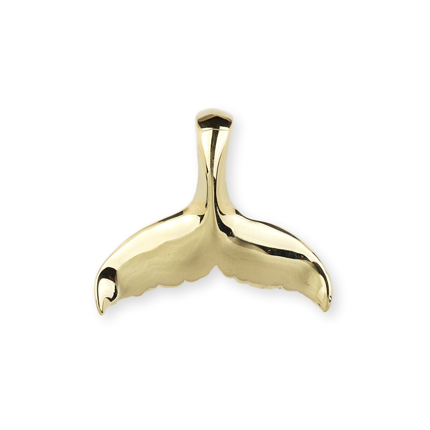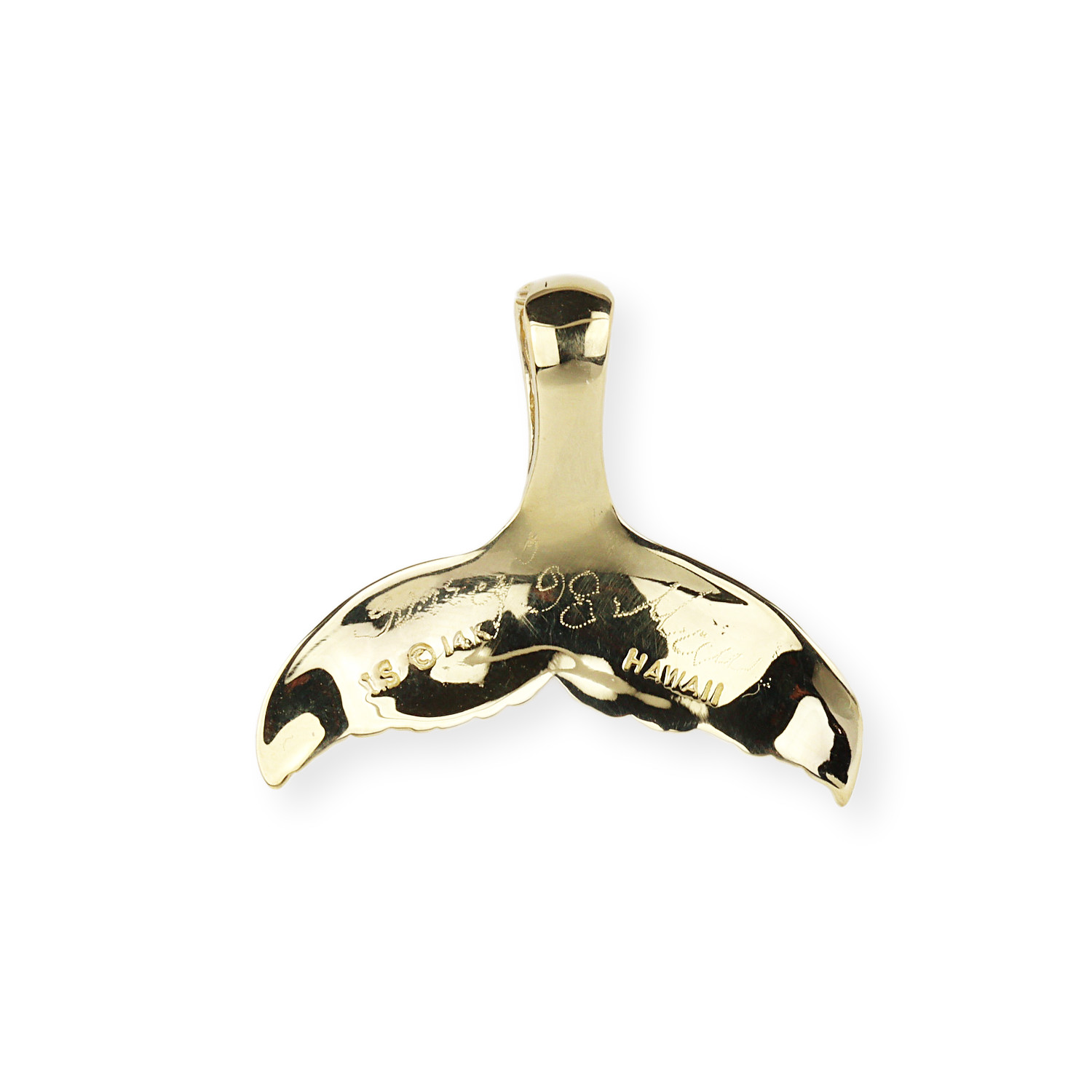 14k yellow gold whale tail pendant. It measures 22mm tall, 27mm at the widest, the bail will fit a 3.5mm chain, and weighs 2.1 grams.