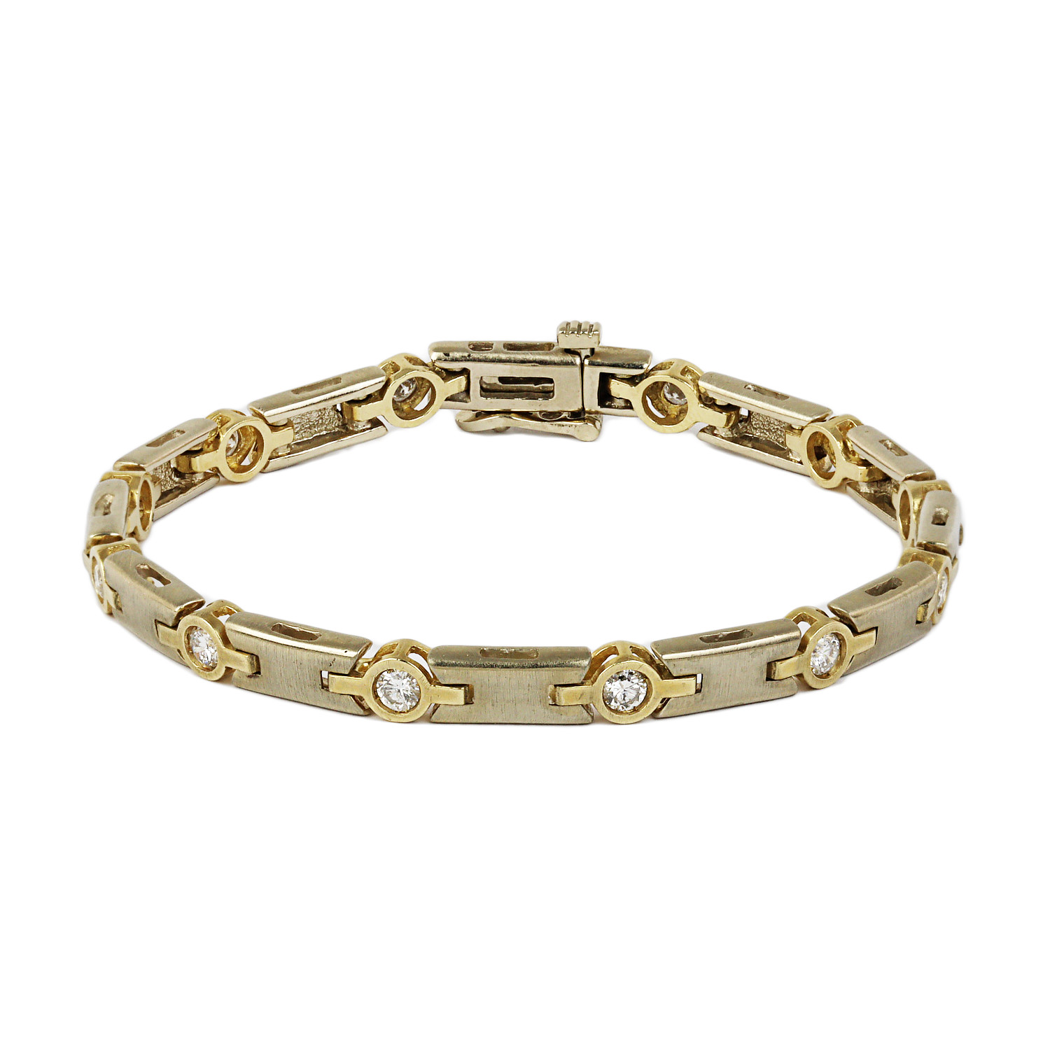 14k yellow and white gold bracelet with diamonds which amount to approximately 1.15 carat TW (SI1-SI2 clarity/G-H-I color). It measures 7″ long, 5mm wide, and weighs 16.6 grams.