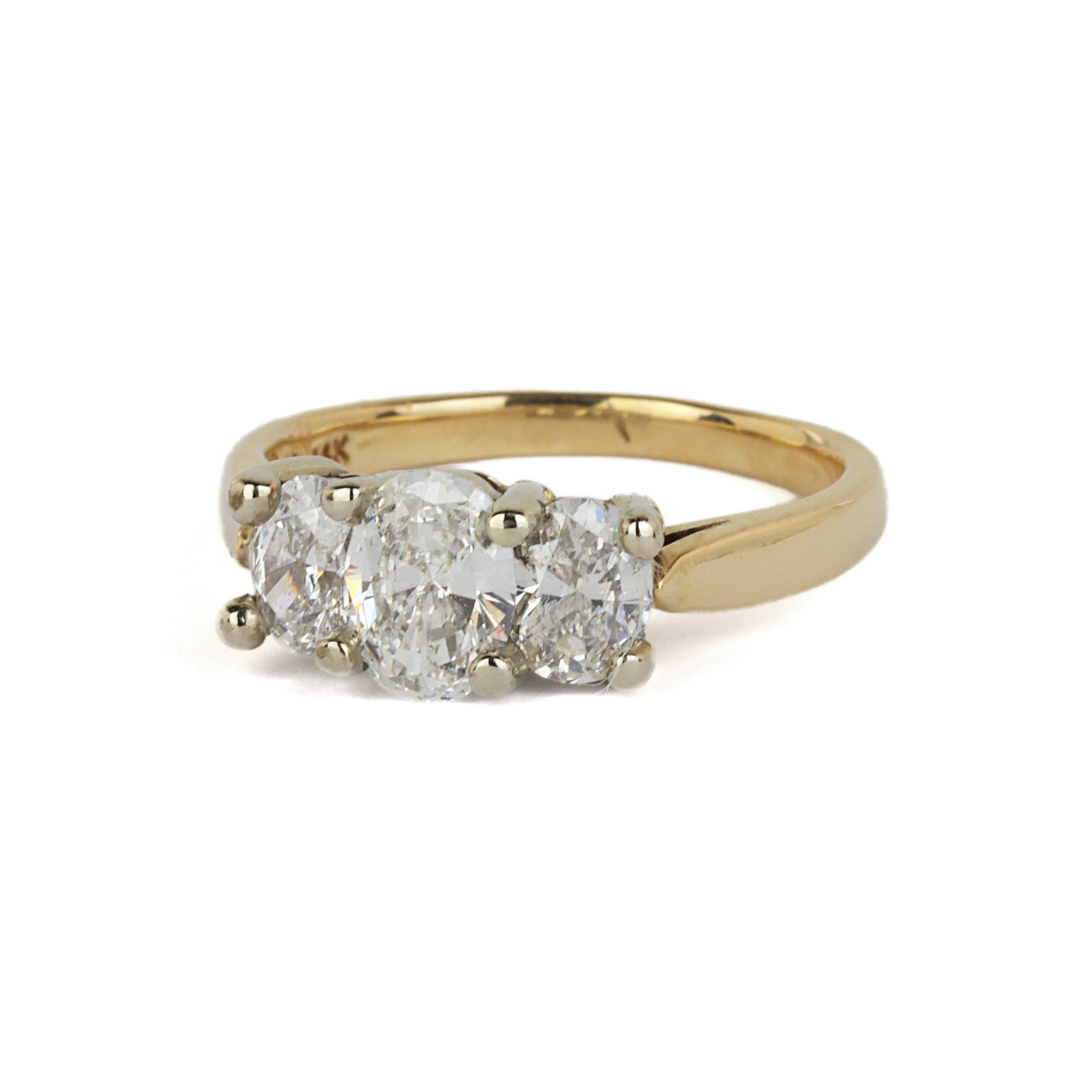 14k yellow and white gold ring with oval diamonds which amount to approximately 1.35 carat TW (I1 clarity/G-H-I color). Fits a size 7 finger, measures 7mm wide across the top, and weighs 4.5 grams.