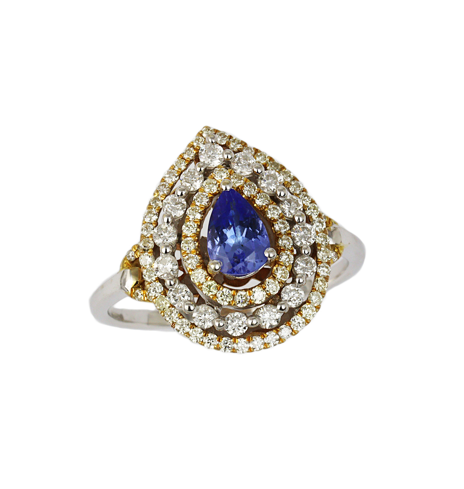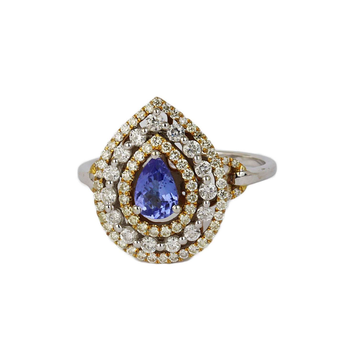 14k white gold ring with a tanzanite stone and diamonds which amount to approximately 0.50 carat TW (SI1-I1 clarity/G-H-I color). It measures 16mm wide across the top, fits a size 6.75 finger, and weighs 3.1 grams.
