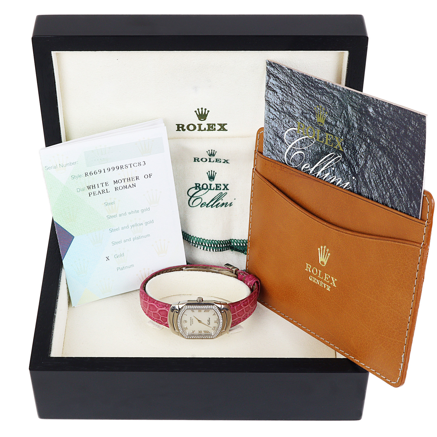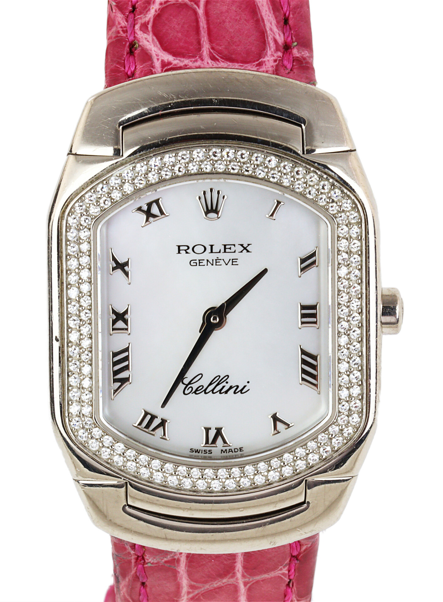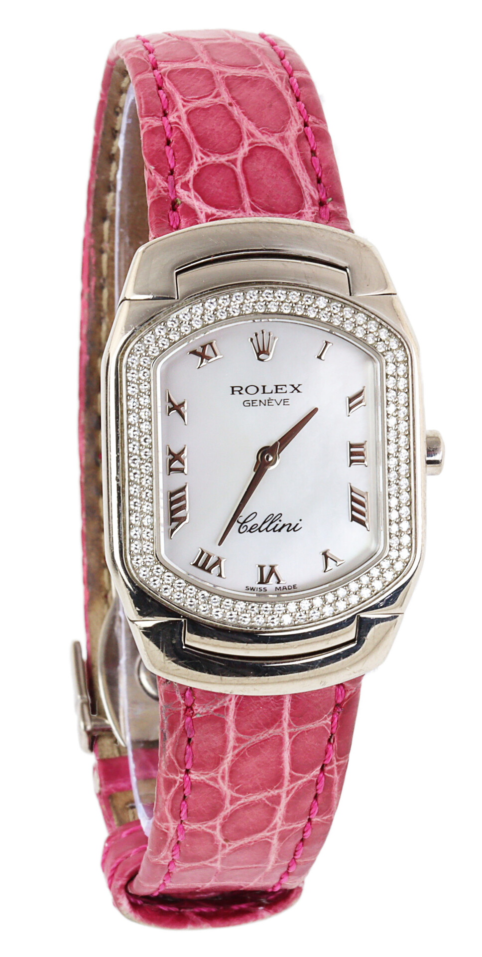 Rolex women’s 18k white gold Cellini 6691 wristwatch. Featuring a mother of pearl face with diamond accents and a pink crocodile style leather band. Made circa 2003-2005. Documents are included in the sale.