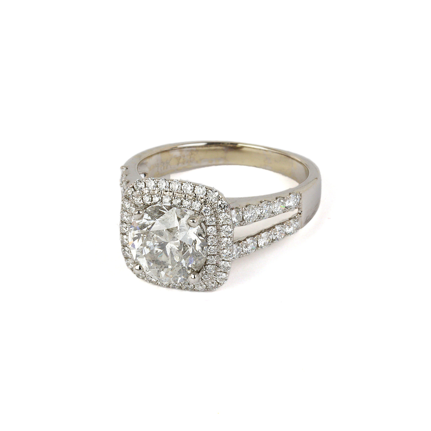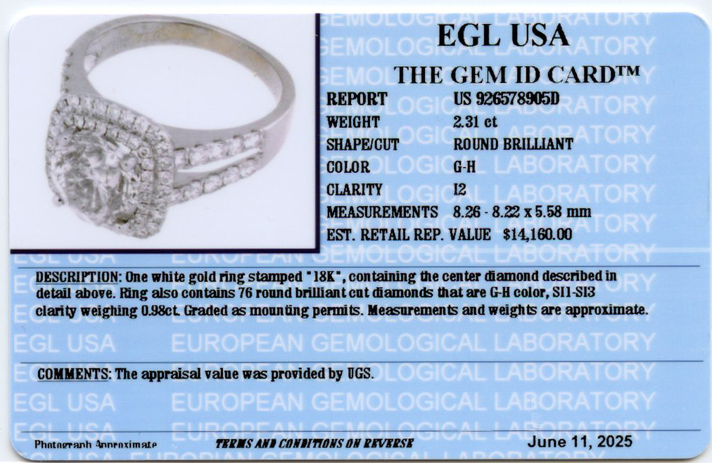 18k white gold ring with a round brilliant cut 2.31 carat center diamond (I2 clarity/G-H color) and featuring accent diamonds which amount to approximately 0.98 carat TW (SI1-SI3 clarity/G-H color). Fits a size 7 finger, measures 12mm wide across the top, and weighs 5.1 grams. EGL cert # 9265789050 is included in the sale.