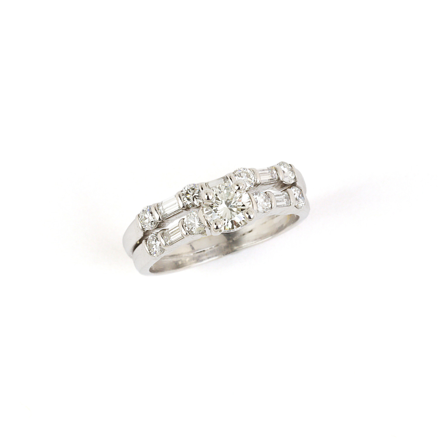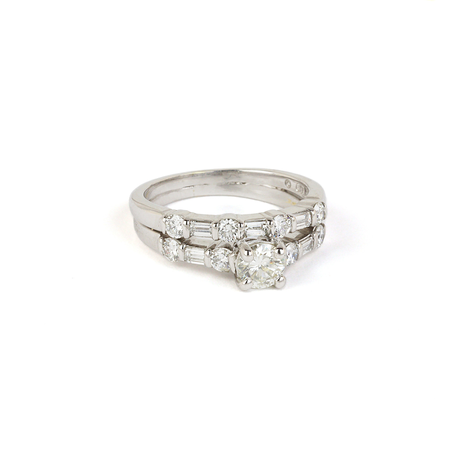 18k white gold ring with diamonds which amount to approximately 1.10 carat TW (VS1-SI1 clarity/G-H-I color). Fits a size 6 finger, measures 6mm wide across the top, and weighs 5.6 grams. The band and ring are soldered together.