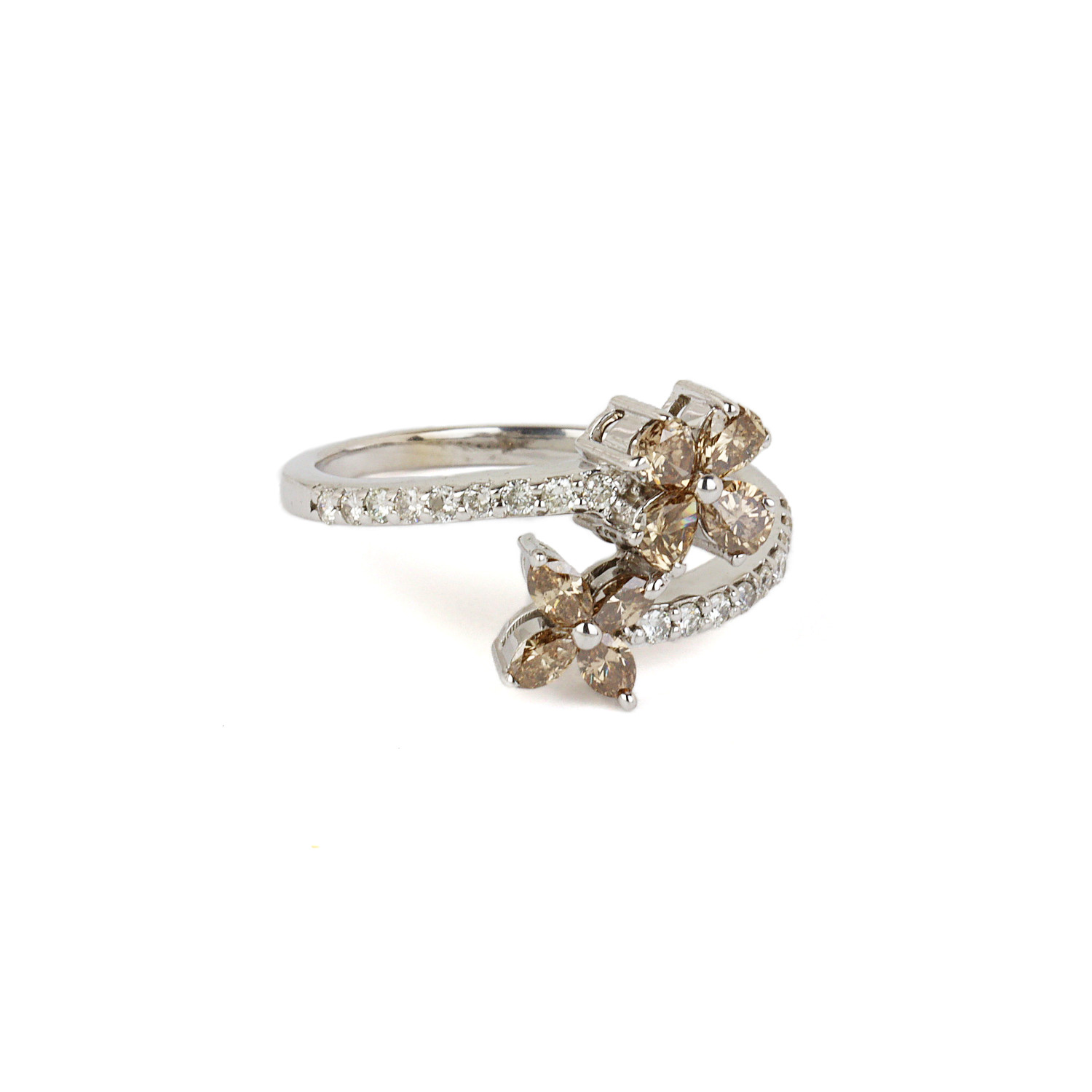 18k white gold flower ring with diamonds which amount to approximately 0.80 carat TW (SI2-I1 clarity/G-H-I & cognac color). Fits a size 6.75 finger, measures 12mm wide across the top, and weighs 3.7 grams.