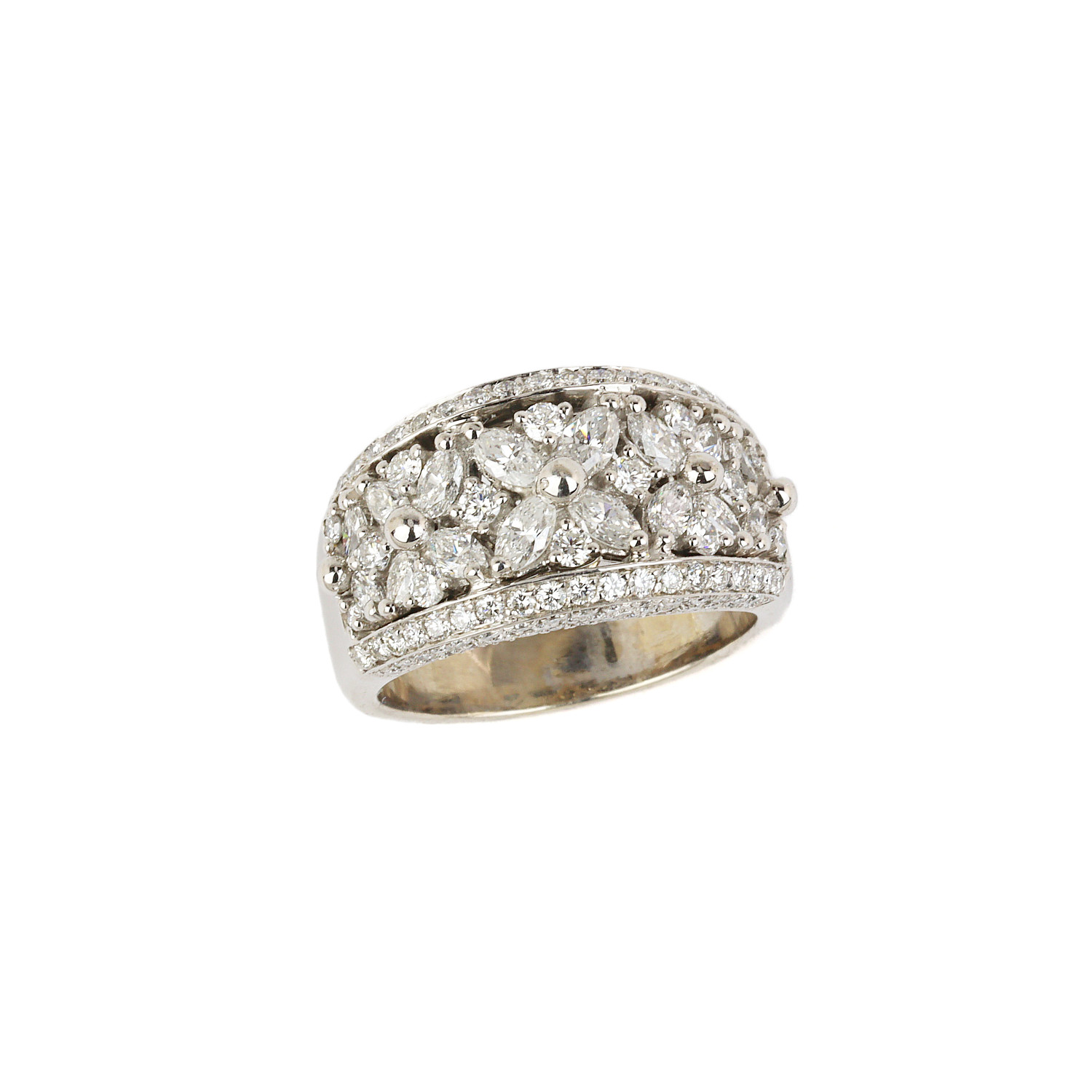 18k white gold flower ring with diamonds which amount to approximately 2.00 carat TW (VS-SI clarity/G-H-I color). Fits a size 7 full finger, measures 12mm wide across the top, and weighs 13.5 grams.