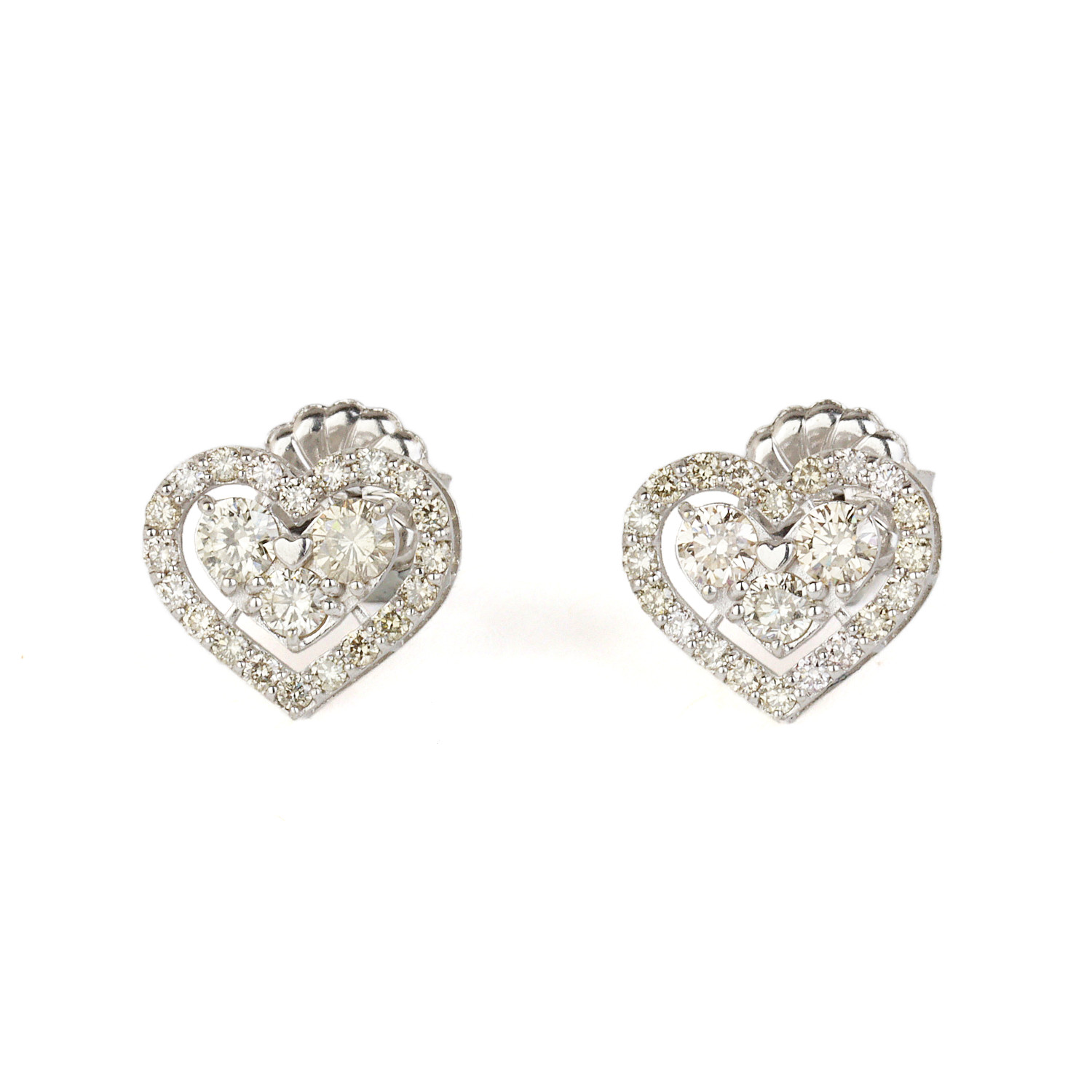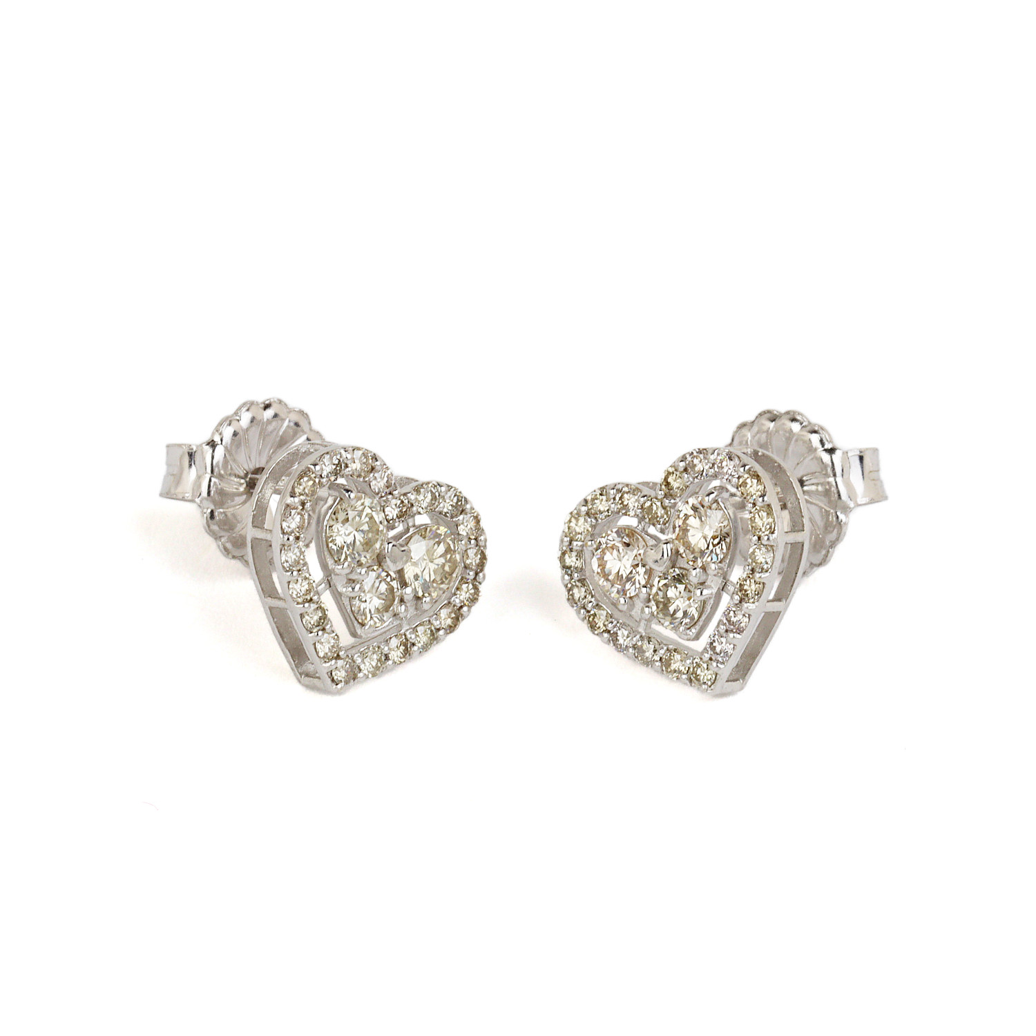 18k white gold heart earrings with diamonds which amount to approximately 1.00 carat TW (VS2-I1 clarity/H-I-J color). They measure 9mm tall, 11mm at the widest, and total weight is 2.1 grams. The backings are 14k white gold.