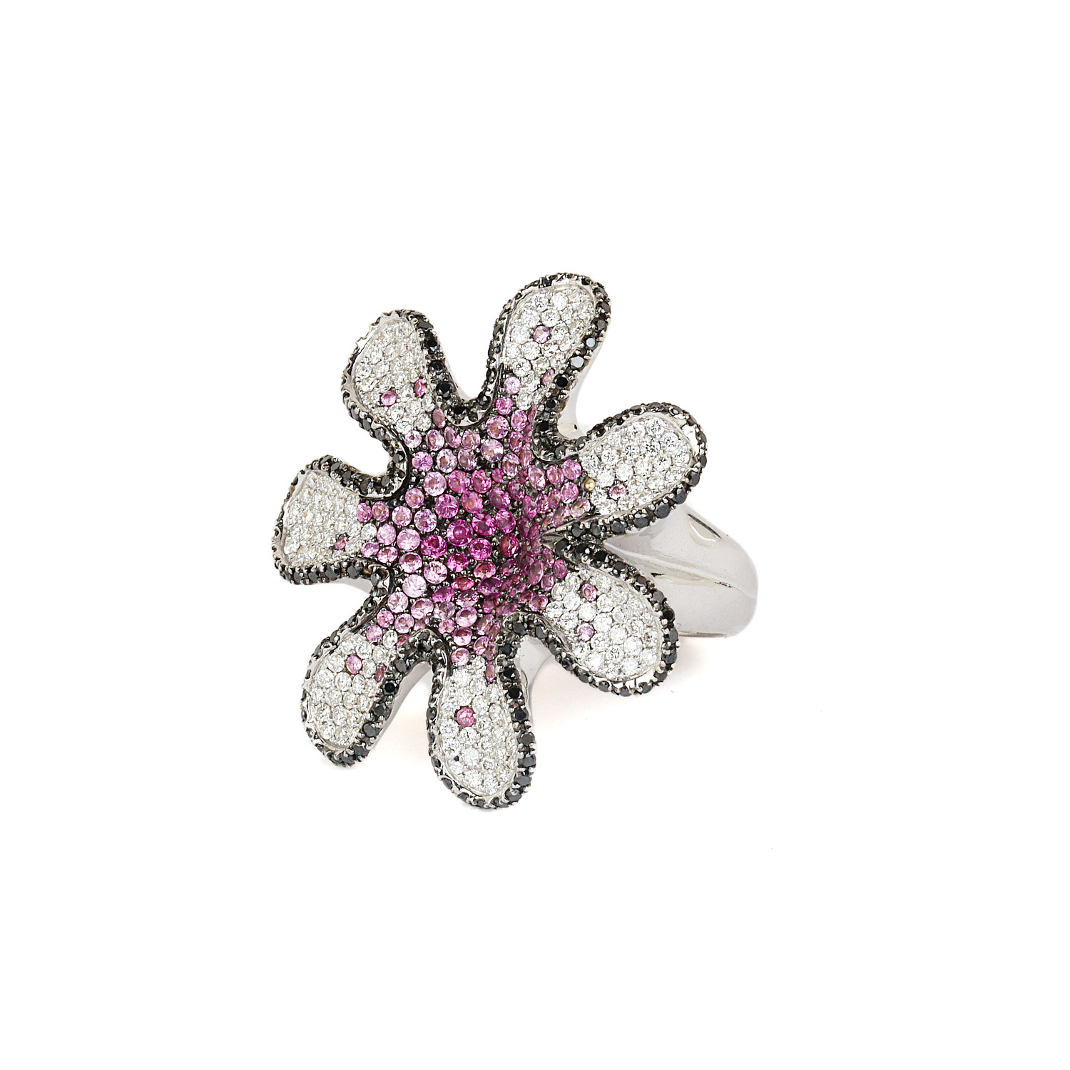 18k white gold ring with pink sapphire stones and diamonds which amount to approximately 2.25 carat TW. Fits a size 7 finger, measures 35mm wide across the top, and weighs 31.0 grams.