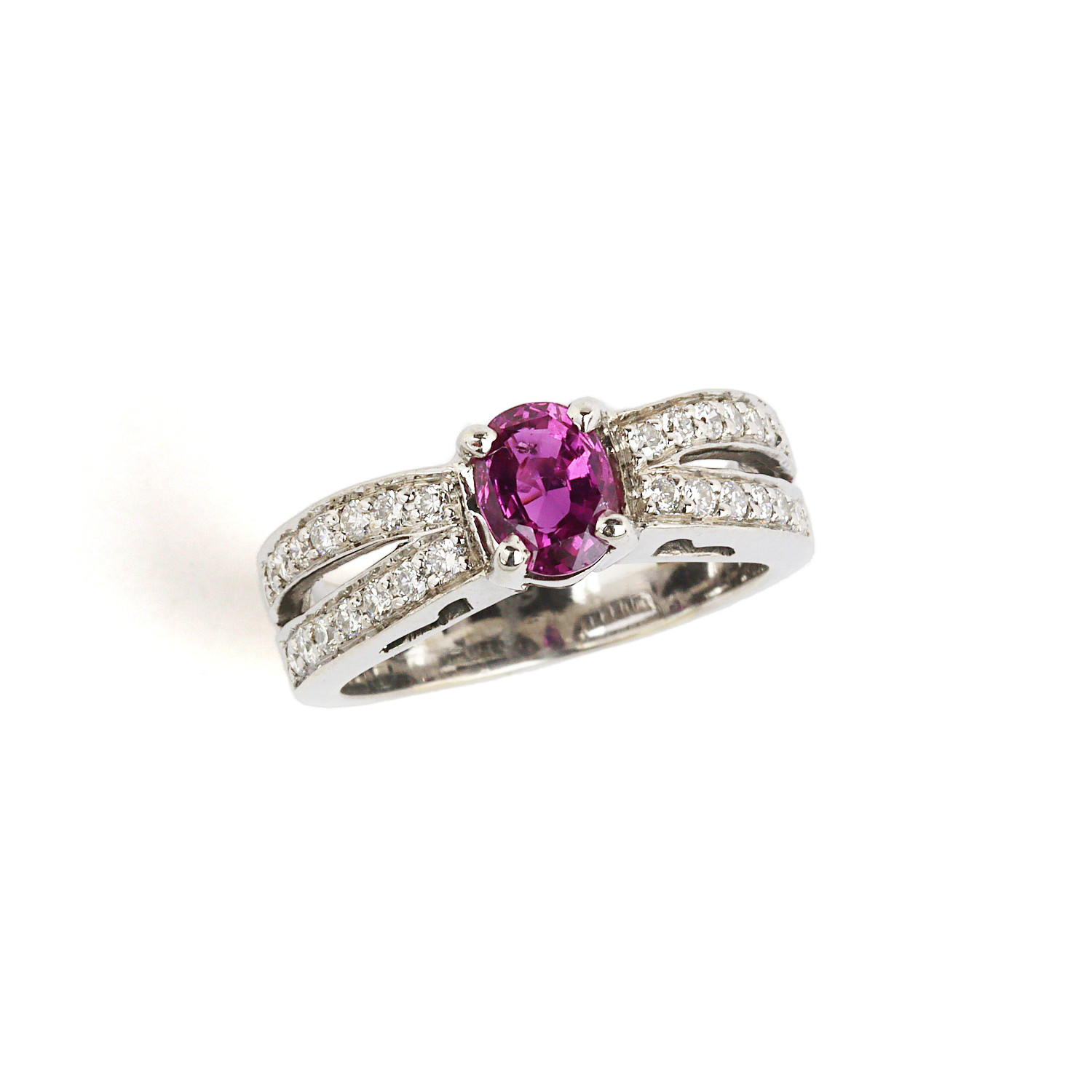 18k white gold ring with a 6.5mm by 5mm pink sapphire and diamonds which amount to approximately 0.50 carat TW (SI1-I1 clarity/G-H-I color). Fits a size 6 finger, measures 6.5mm wide across the top, and weighs 8.3 grams.