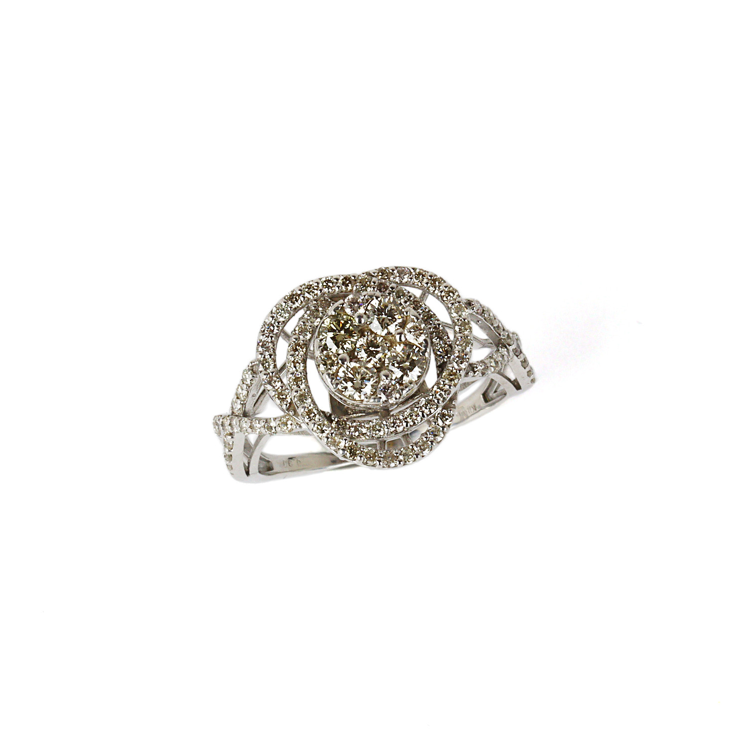 18k white gold ring with diamonds which amount to approximately 0.90 carat TW (SI2-I1 clarity/I-J-K color). Fits a size 6 finger, measures 13mm wide across the top, and weighs 3.1 grams.