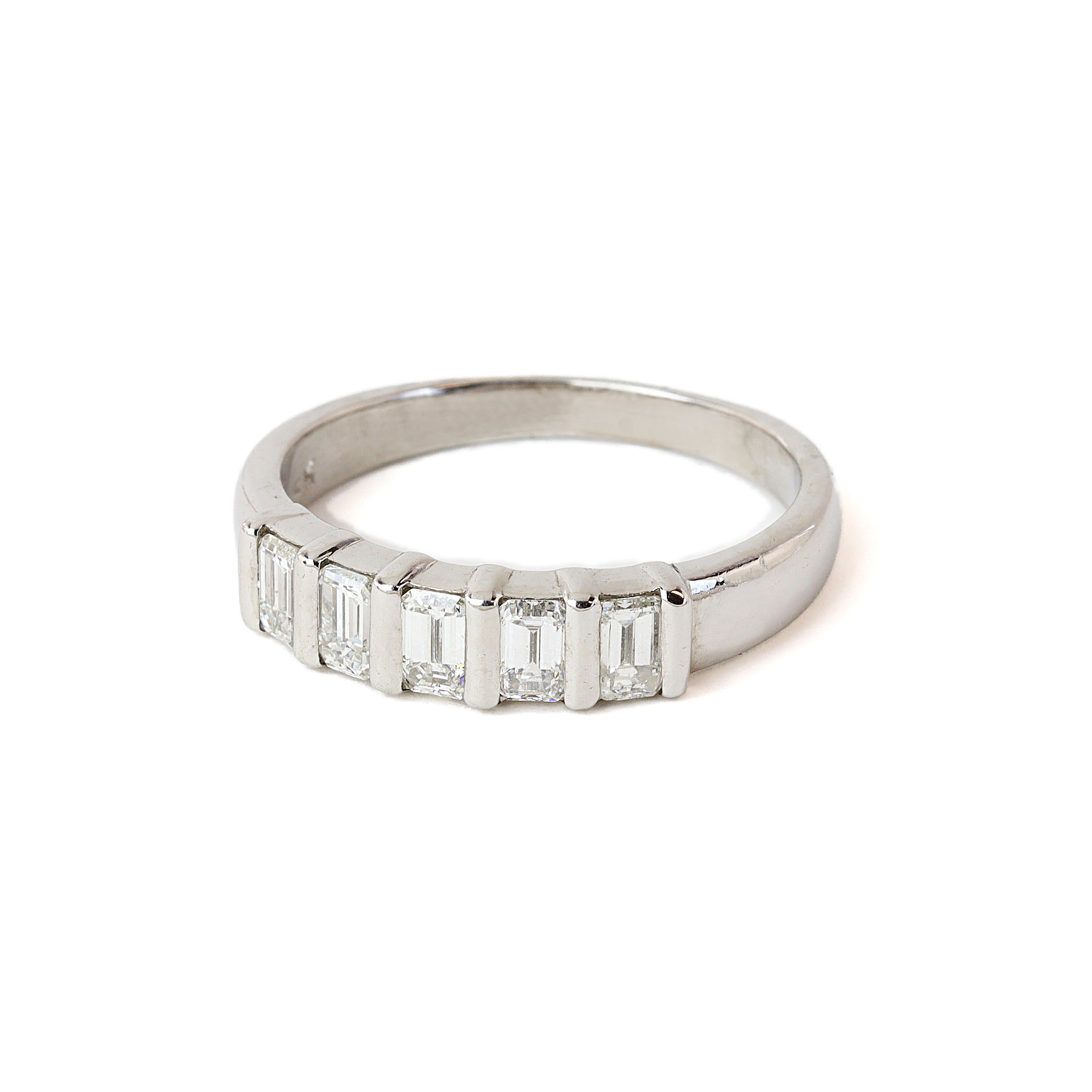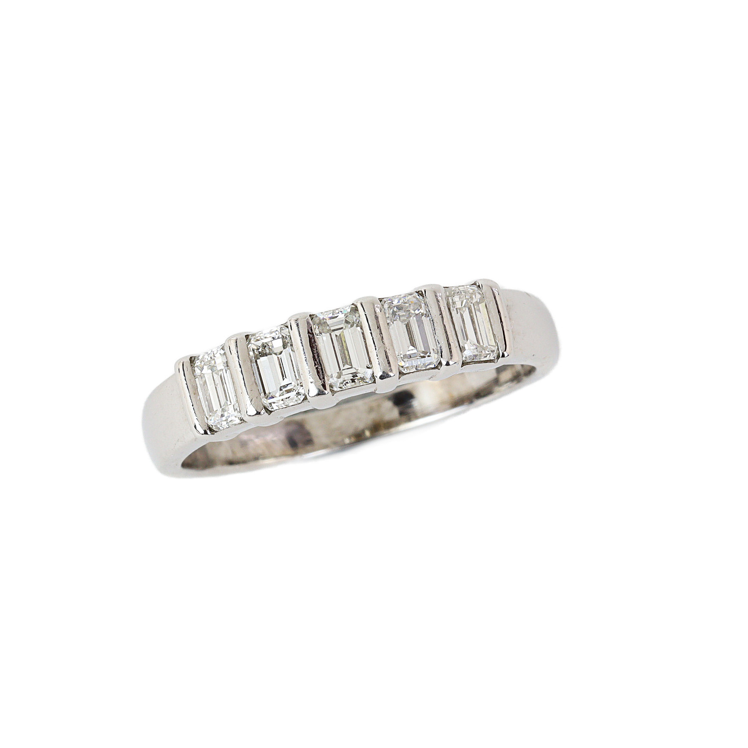 18k white gold ring with diamonds which amount to approximately 1.00 carat TW (VS1-VS2 clarity/F-G color). Fits a size 8.5 finger, measures 5mm wide across the top, and weighs 6.8 grams.