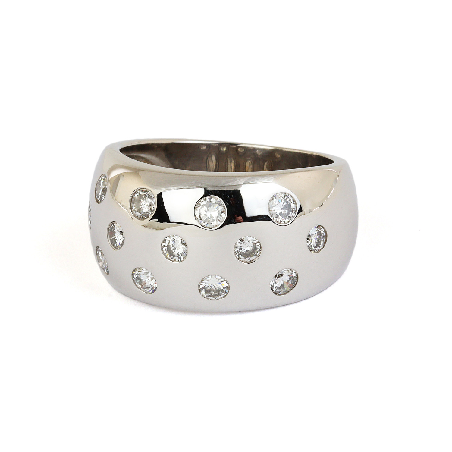 18k white gold ring with diamonds which amount to approximately 1.00 carat TW (SI2-I1 clarity/G-H-I color). Fits a size 8.75 finger, measures 13mm wide across the top, and weighs 11.2 grams.