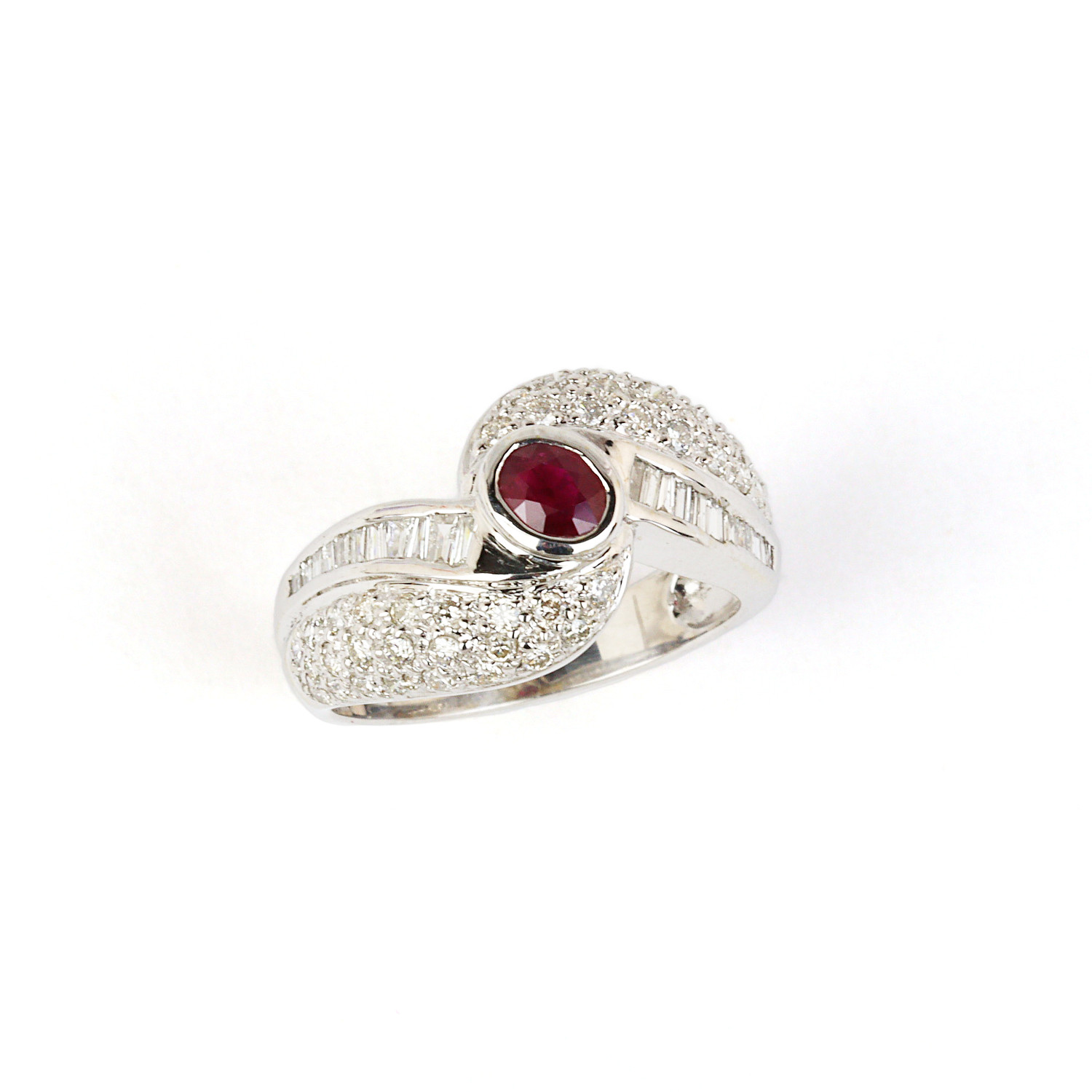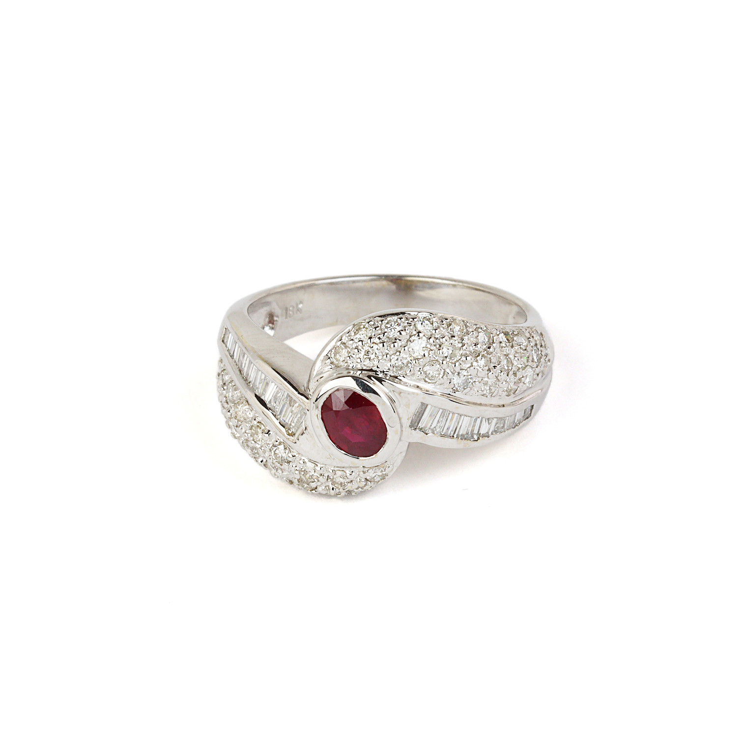 18k white gold ring with a 4mm by 3mm natural ruby and diamonds which amount to approximately 0.90 carat TW (SI2-I1 clarity/G-H-I color). Fits a size 6.5 finger, measures 12mm wide across the top, and weighs 4.9 grams.