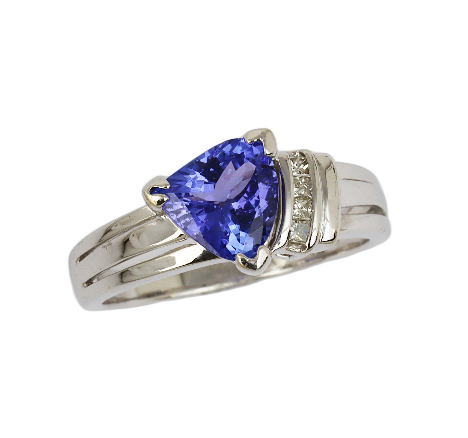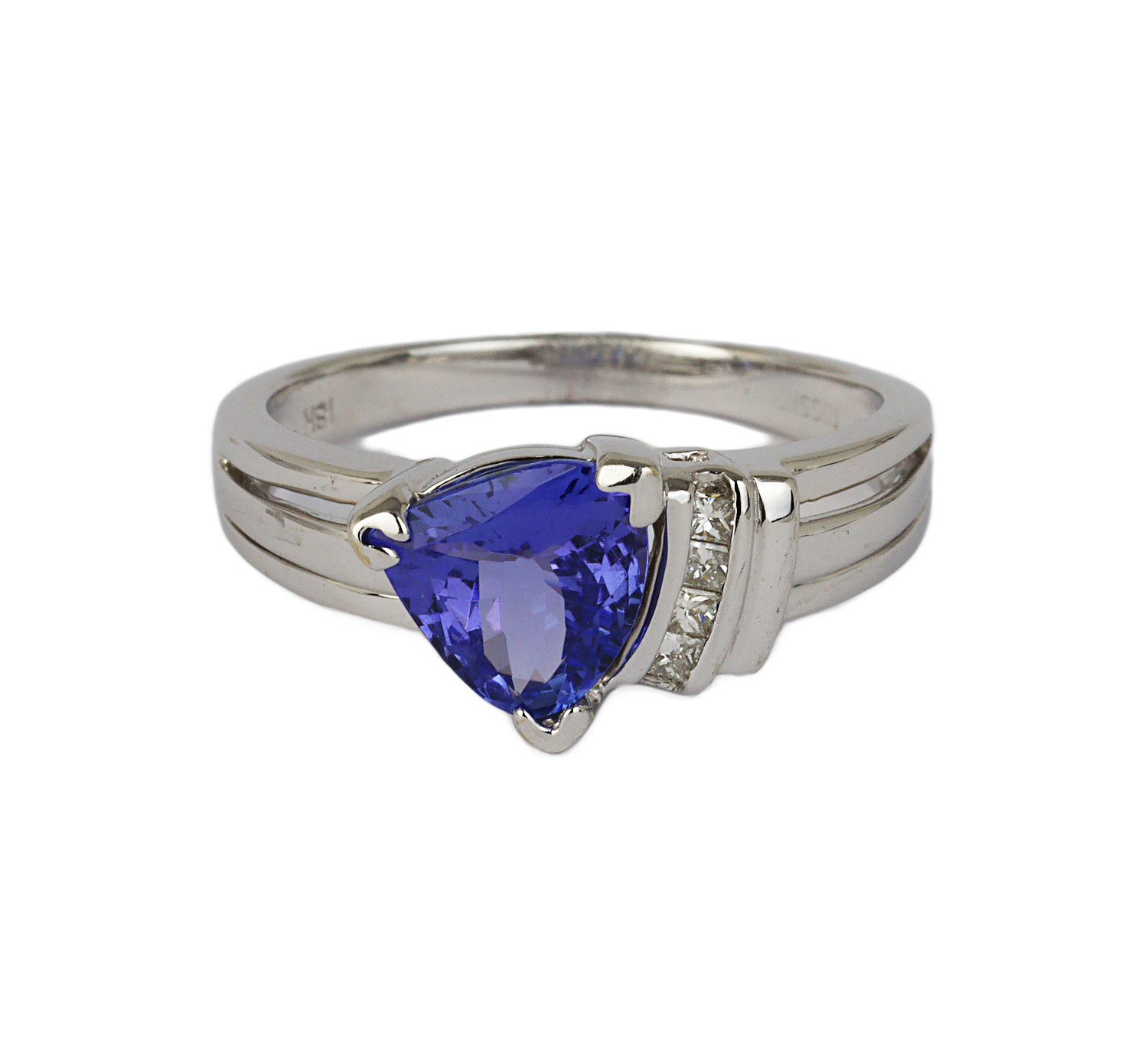 18k white gold ring with a tanzanite stone and diamonds which amount to approximately 0.80 carat TW (VS2-I1 clarity/H-I-J color). It measures 9mm wide across the top, fits a size 7 finger, and weighs 4.4 grams.