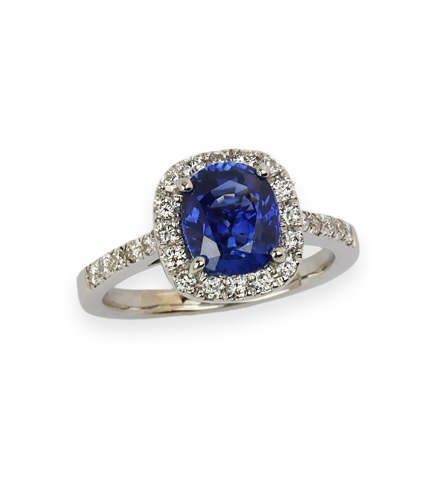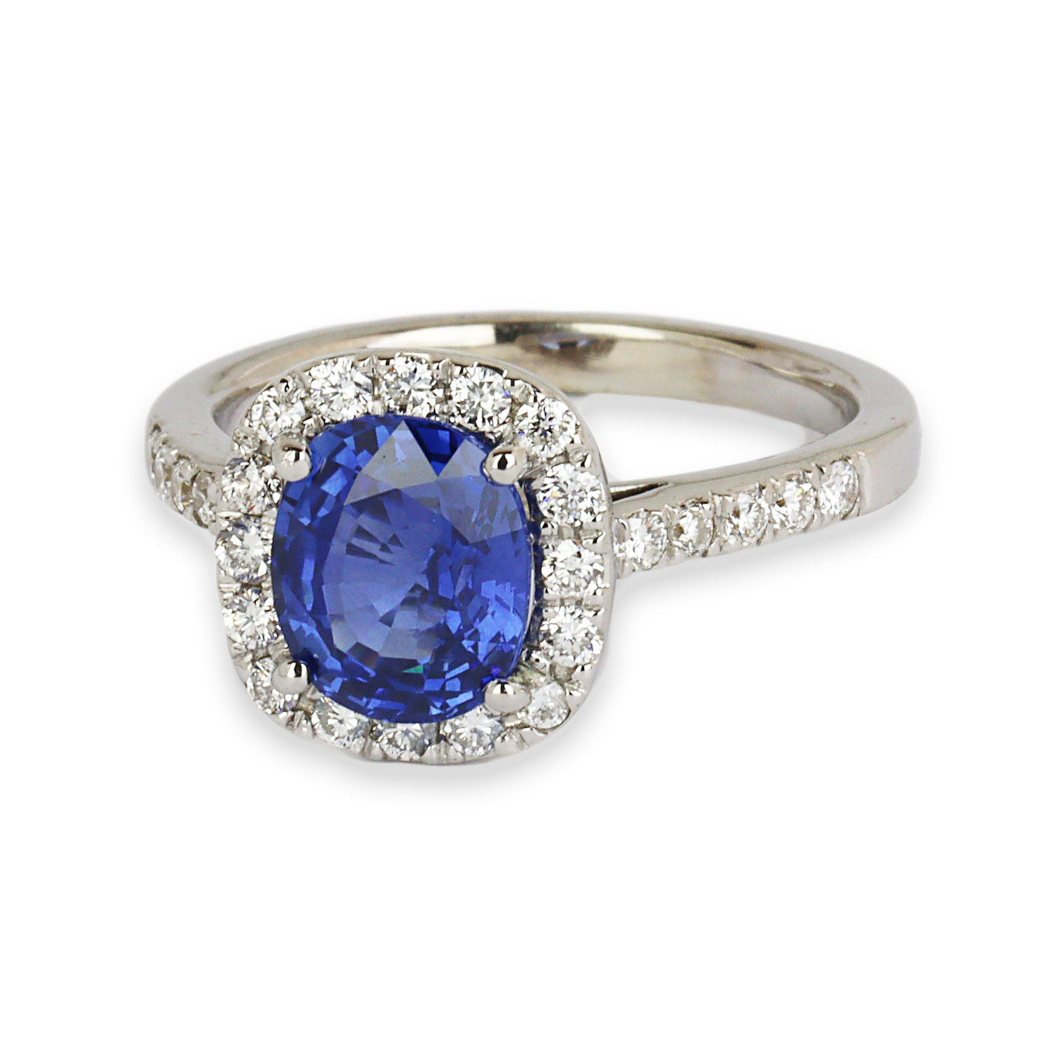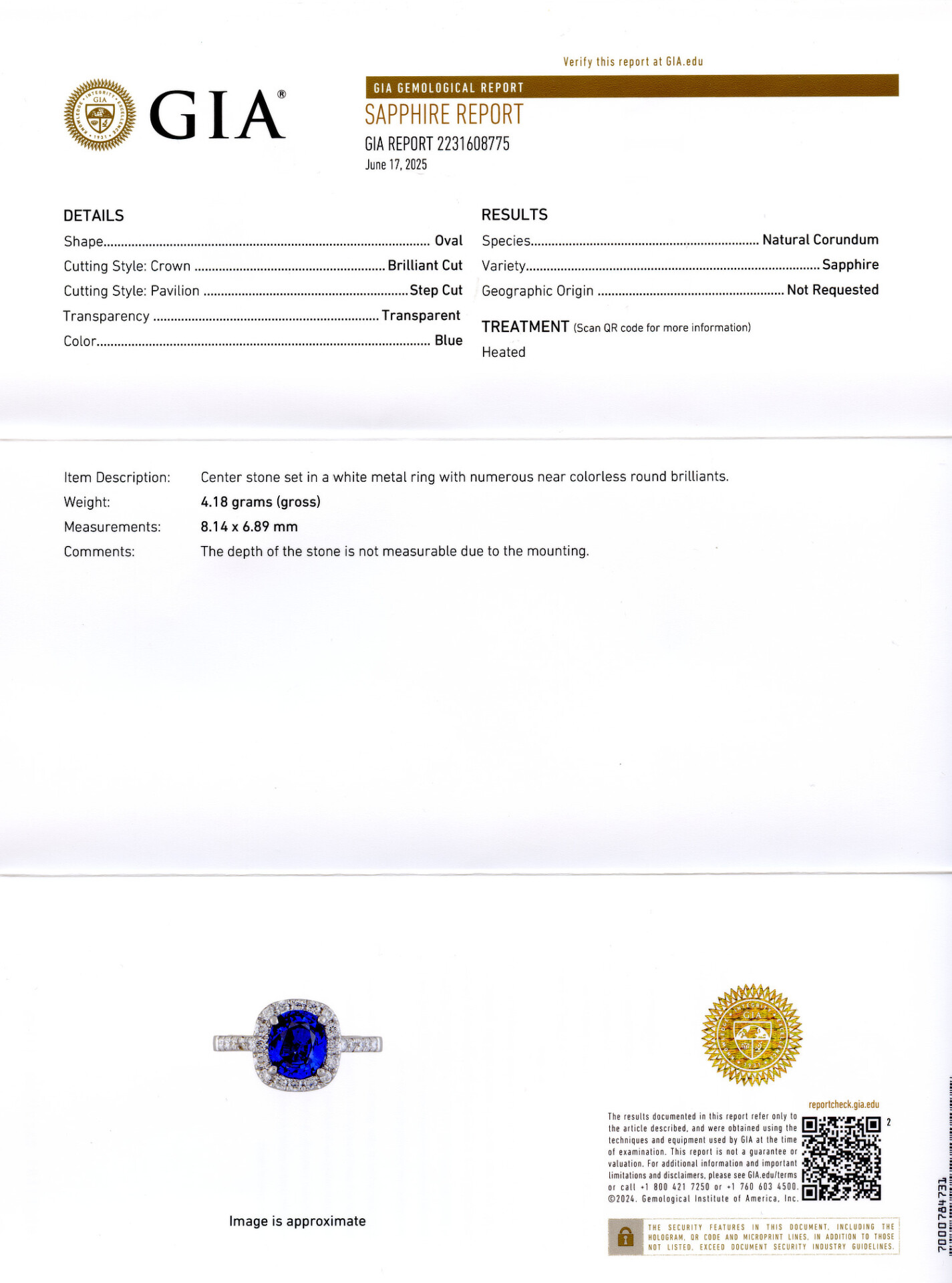 18k white gold ring with a 6.89mm diameter sapphire stone. Fits a size 6 finger, measures 6mm wide across the top, and weighs 4.24 grams. The band has approximately 0.33 tdw sides (VS1-SI1/G-H-I). GIA Certificate #2231608775 is included in the sale.