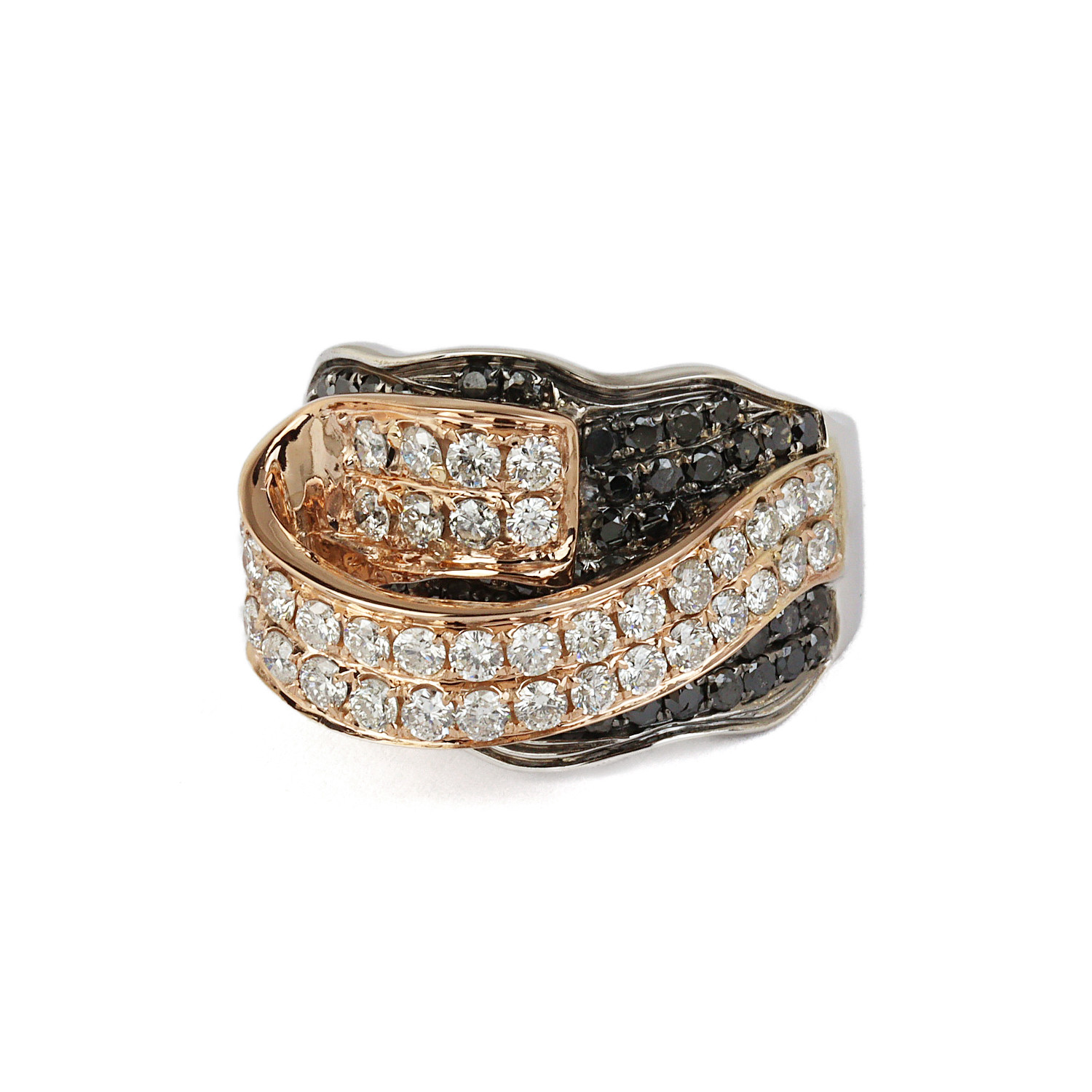 18k white gold ring featuring black round brilliant cut diamonds which amount to 2.29 carat TW and the clear diamonds set in rose gold amount to 1.57 carat TW. Fits a size 9 finger, measures 18mm wide across the top, and weighs 14.5 grams.