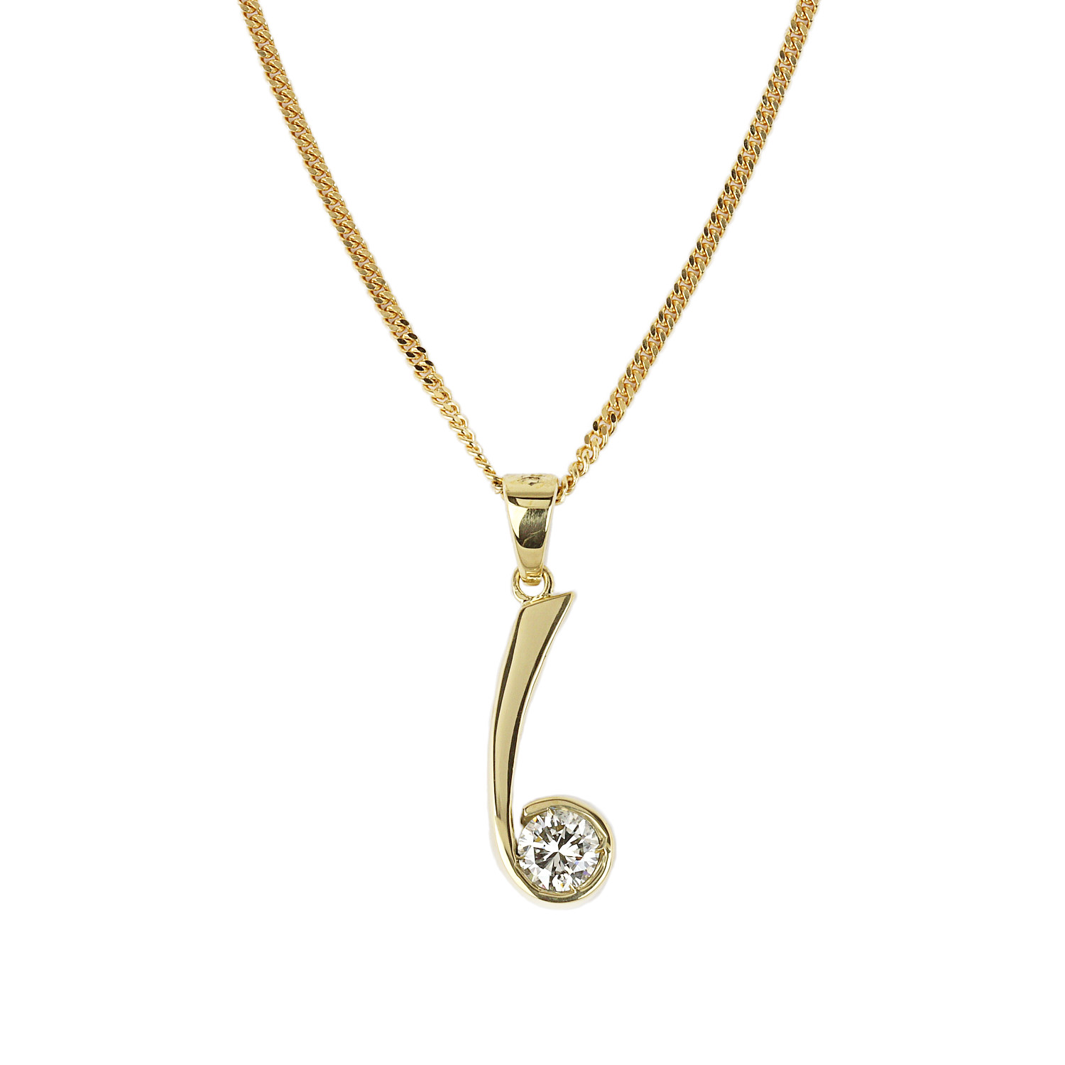 18k yellow gold necklace featuring a pendant containing a 0.50 carat round brilliant cut diamond (VS1 clarity/G-H-I color). The pendant measures 27mm tall, 8mm at the widest, the chain is 20″ long, and total weight is 8.3 grams.