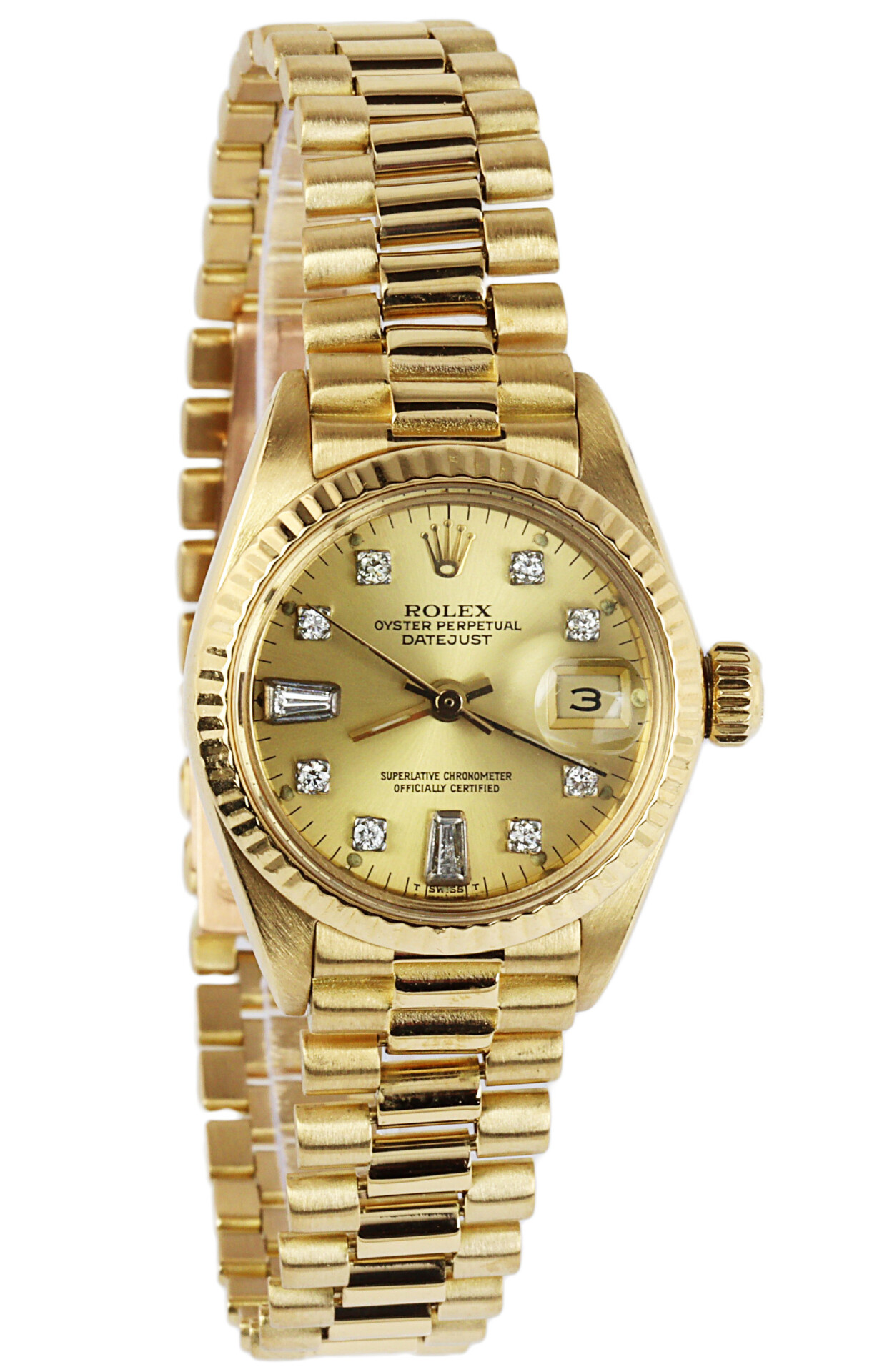 Rolex women’s 18k gold President 6917 wristwatch. Containing diamonds. Made circa 1982. Documents are included in the sale.