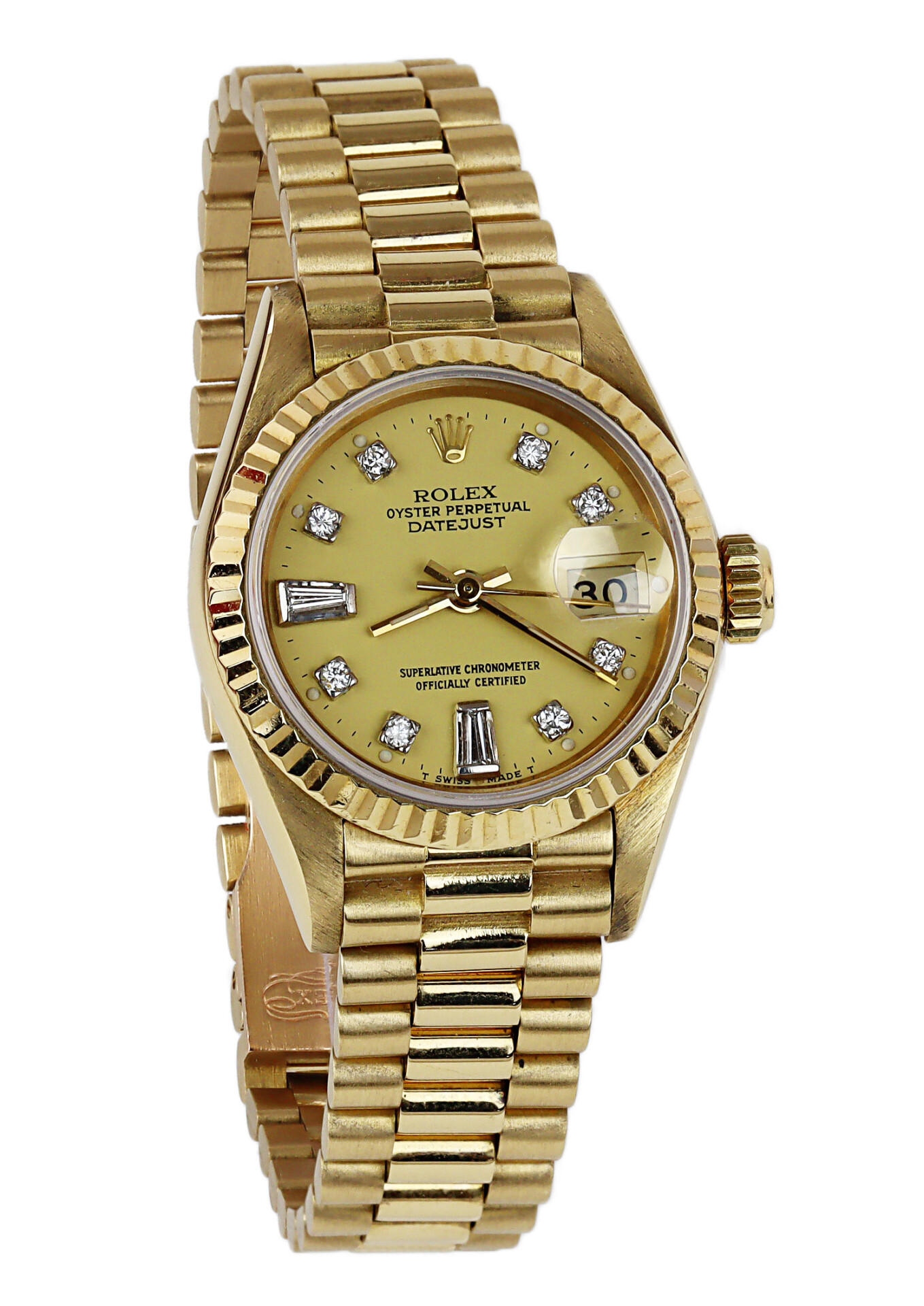 Rolex women’s 18k yellow gold President 69178 wristwatch. Containing diamonds. Made circa 1986. No documents are included.