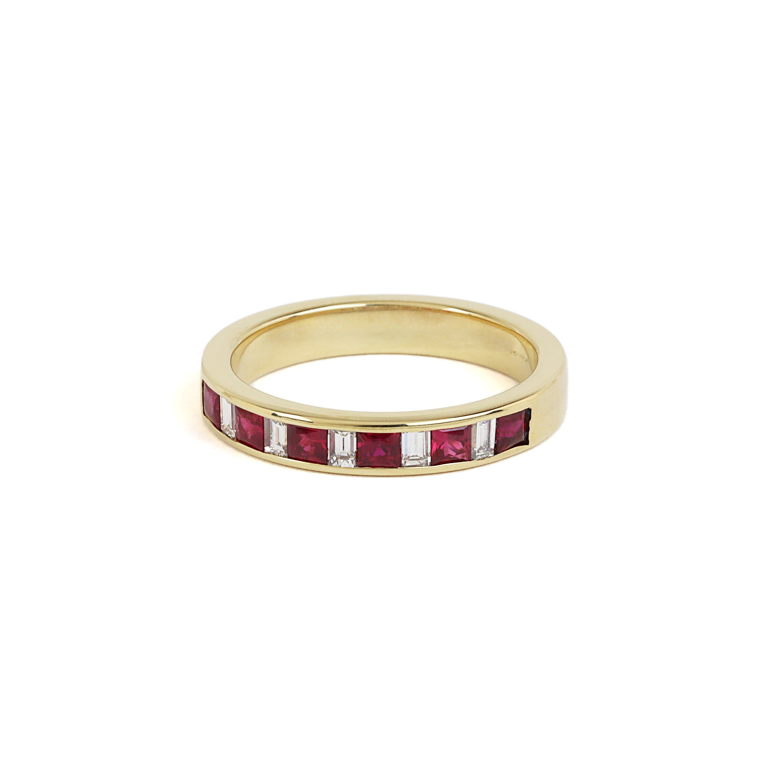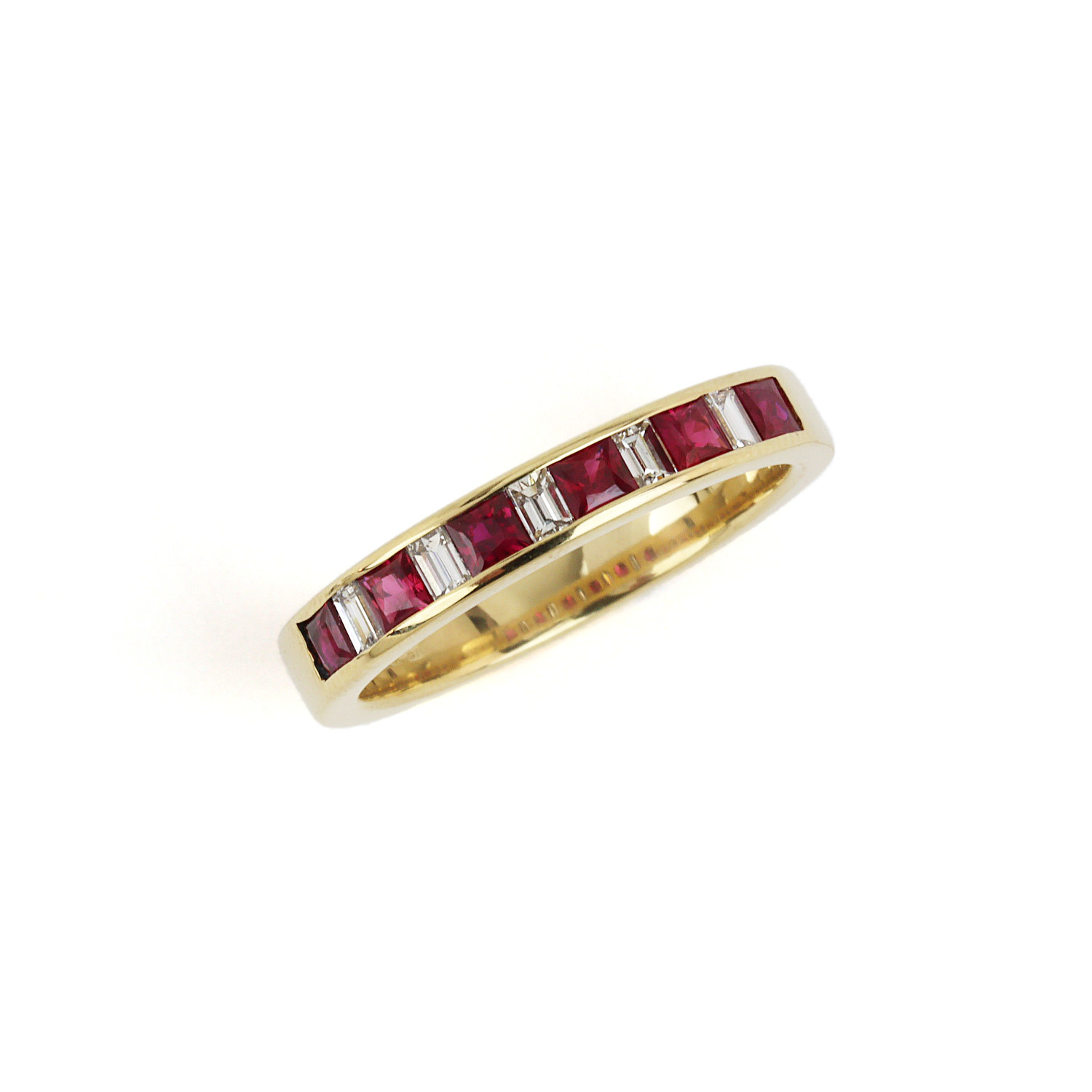 18k yellow gold ring with ruby stones and diamonds which amount to approximately 0.25 carat TW (VS1-VS2 clarity/G-H-I color). Fits a size 8.25 finger, measures 4mm wide, and weighs 5.6 grams.