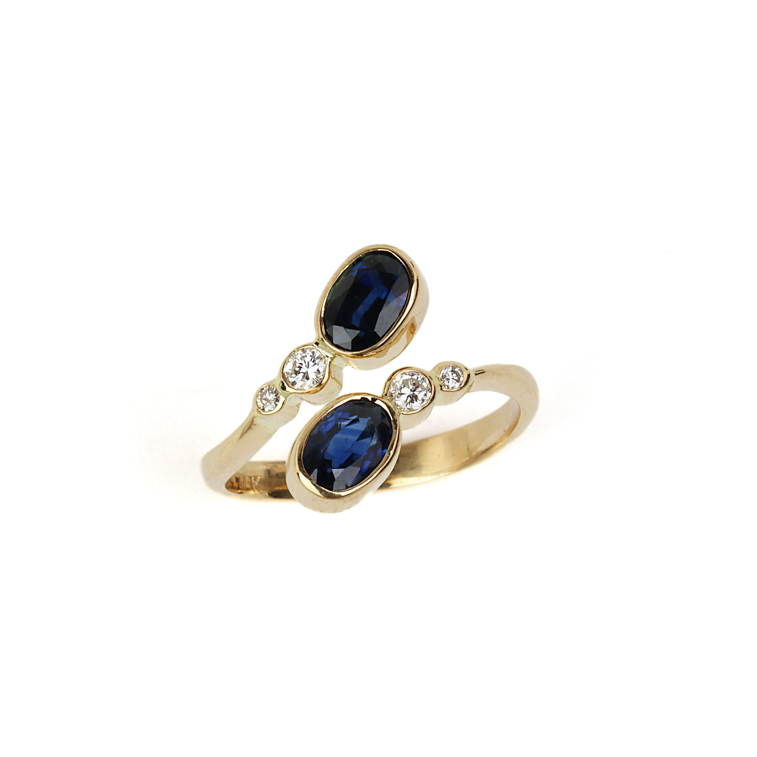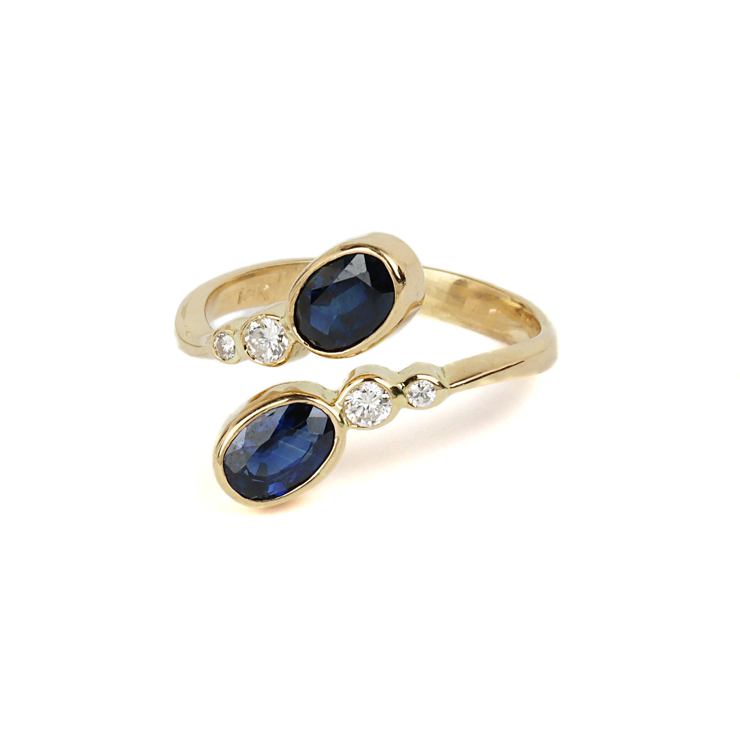 18k yellow gold ring with two 5mm by 4mm oval sapphire stones and diamond accents which amount to approximately 0.15 carat TW (SI1-I1 clarity/G-H-I color). Fits a size 6.25 finger, measures 15mm wide across the top, and weighs 3.2 grams.
