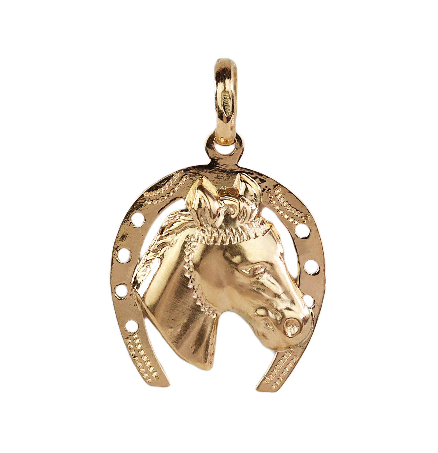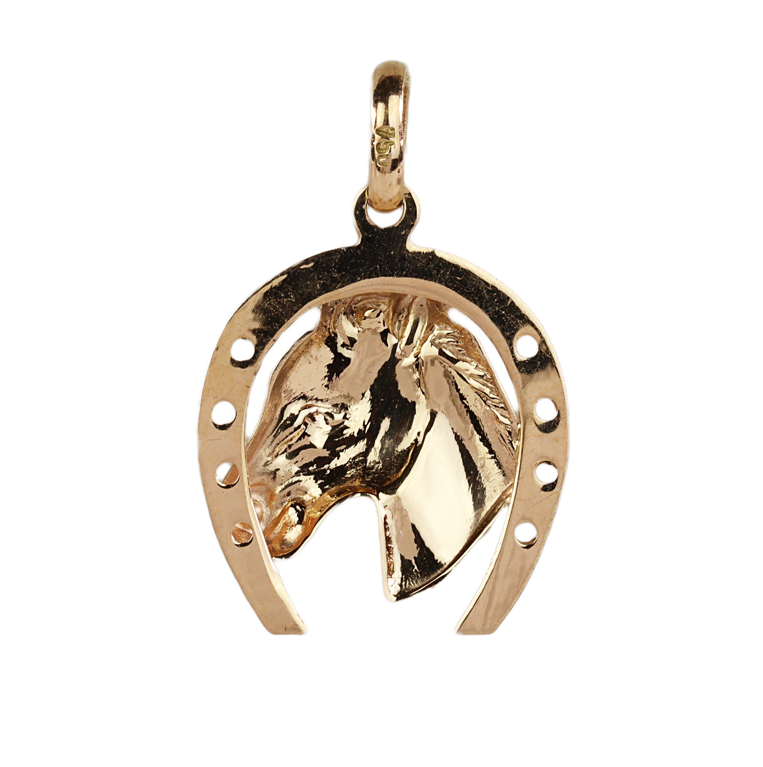 18k yellow gold horseshoe pendant featuring a horse’s head. It measures 22mm tall (not including the bail), 19mm wide, the bail will fit a 2.5mm chain, and weighs 2.0 grams.