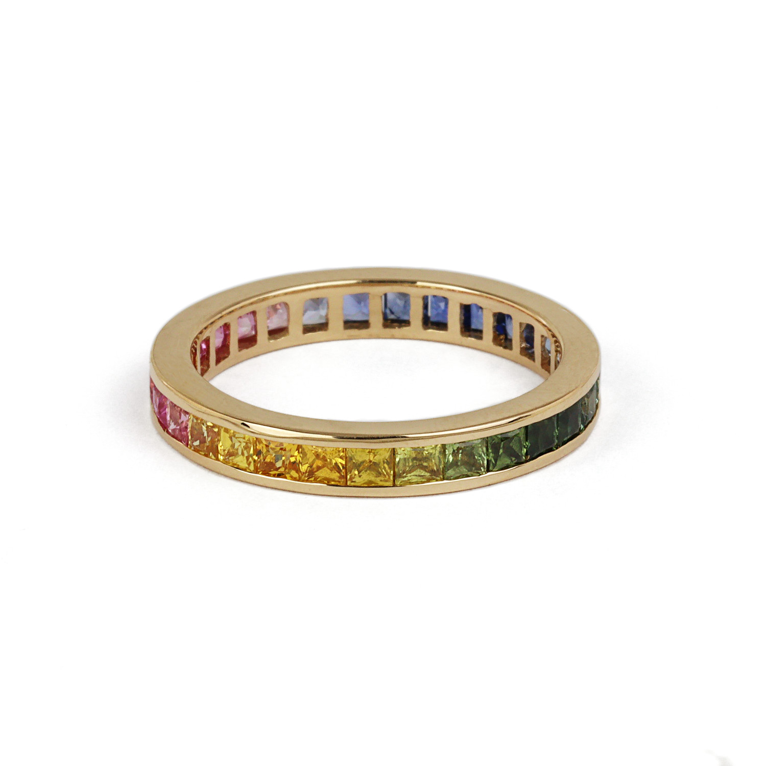 18k yellow gold eternity band with emerald-cut 2mm multi colored sapphire stones. Fits a size 7.25 finger, measures 3mm wide, and weighs 3.0 grams.