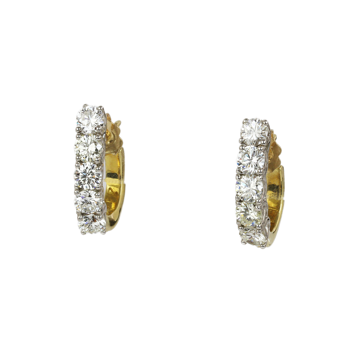 18k yellow gold and platinum half hoop earrings with diamonds which amount to approximately 2.50 carat TW (VS2-SI2 clarity/G-H-I color). They measure 22mm tall, 16mm wide, and total weight is 7.9 grams.