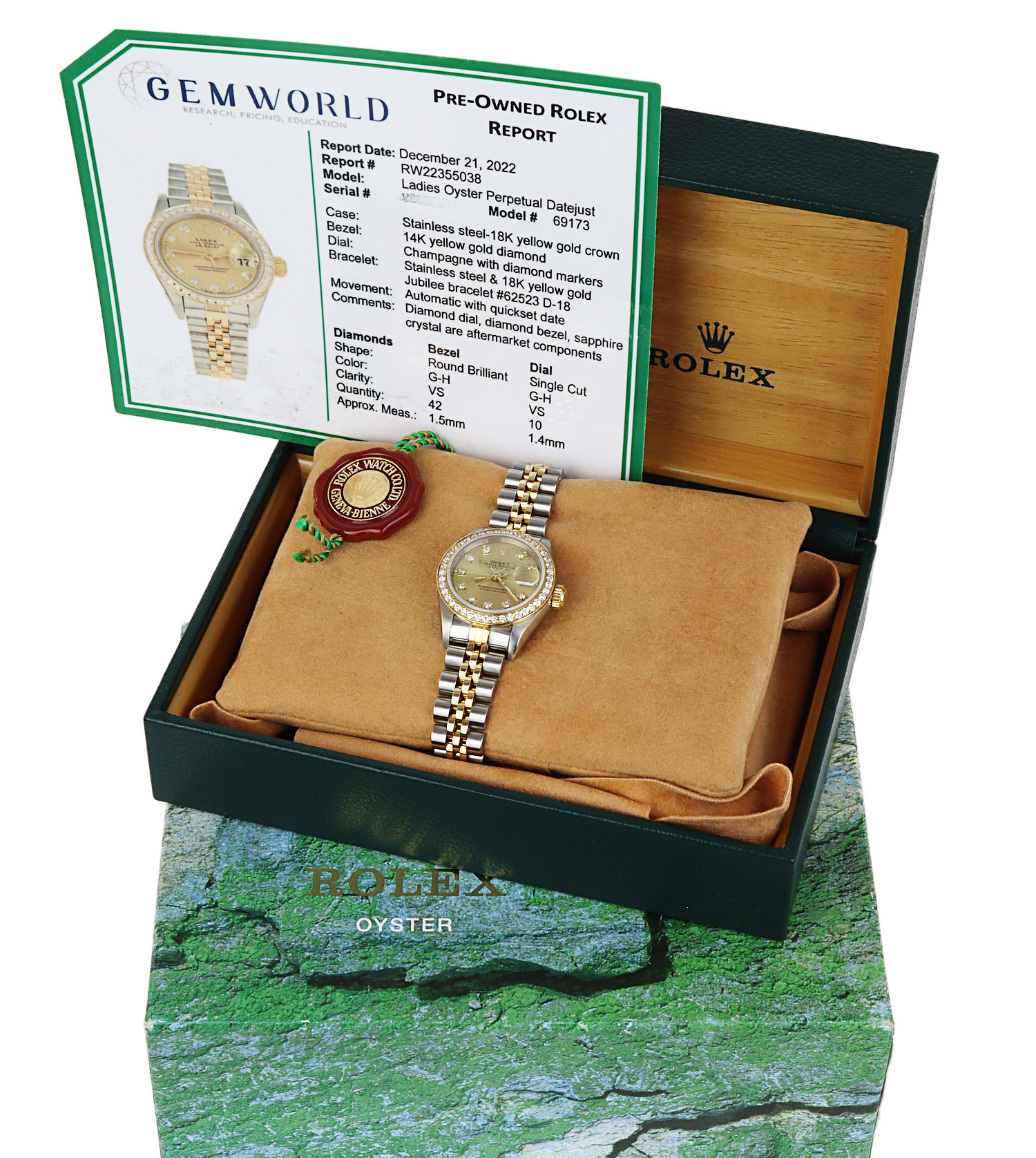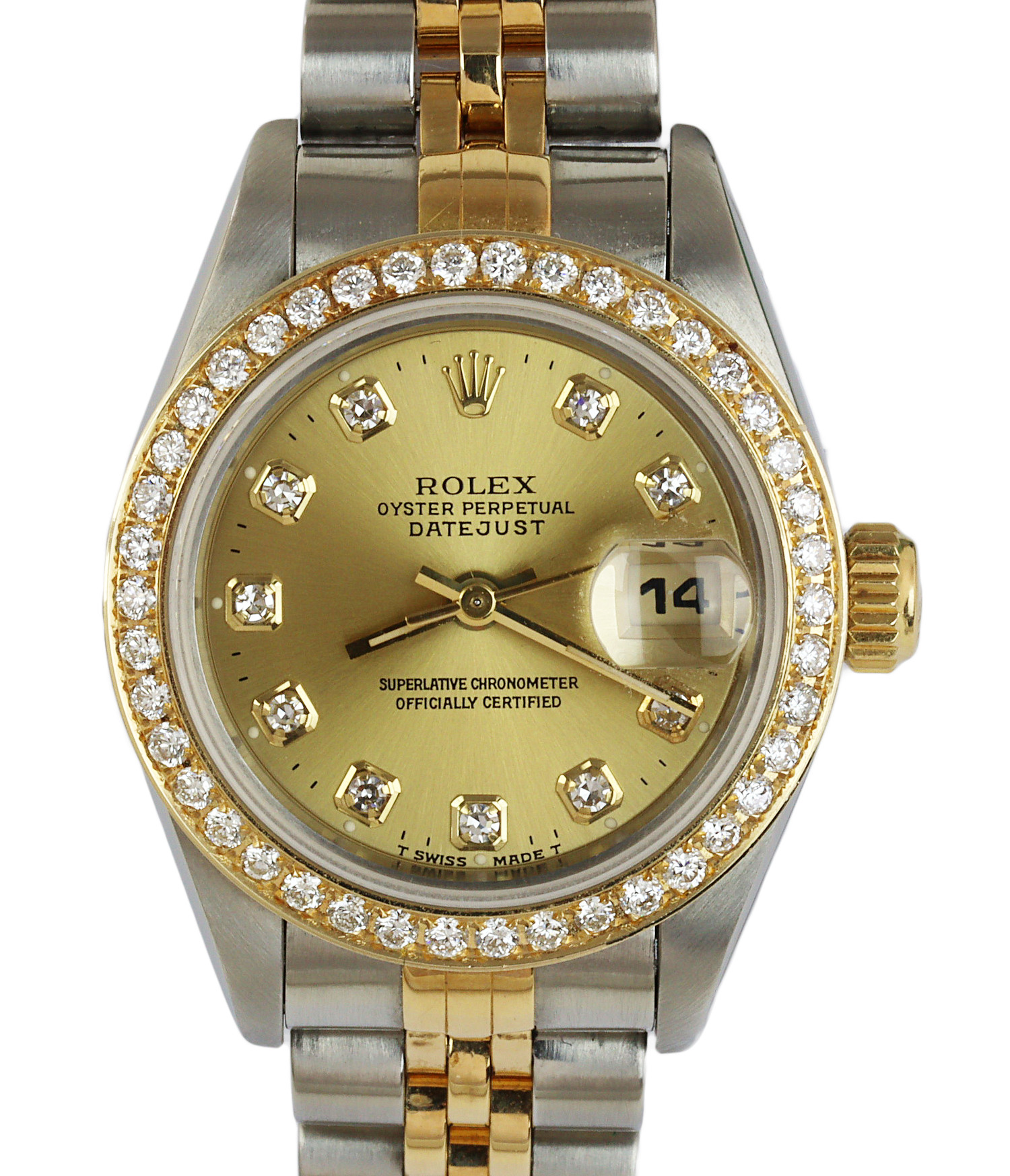 Rolex women’s 18k yellow gold and stainless steel Datejust 69173 wristwatch containing diamonds which amount to approximately 0.53 carat TW of diamonds. Made circa 1995. Generic documents are included in the sale.