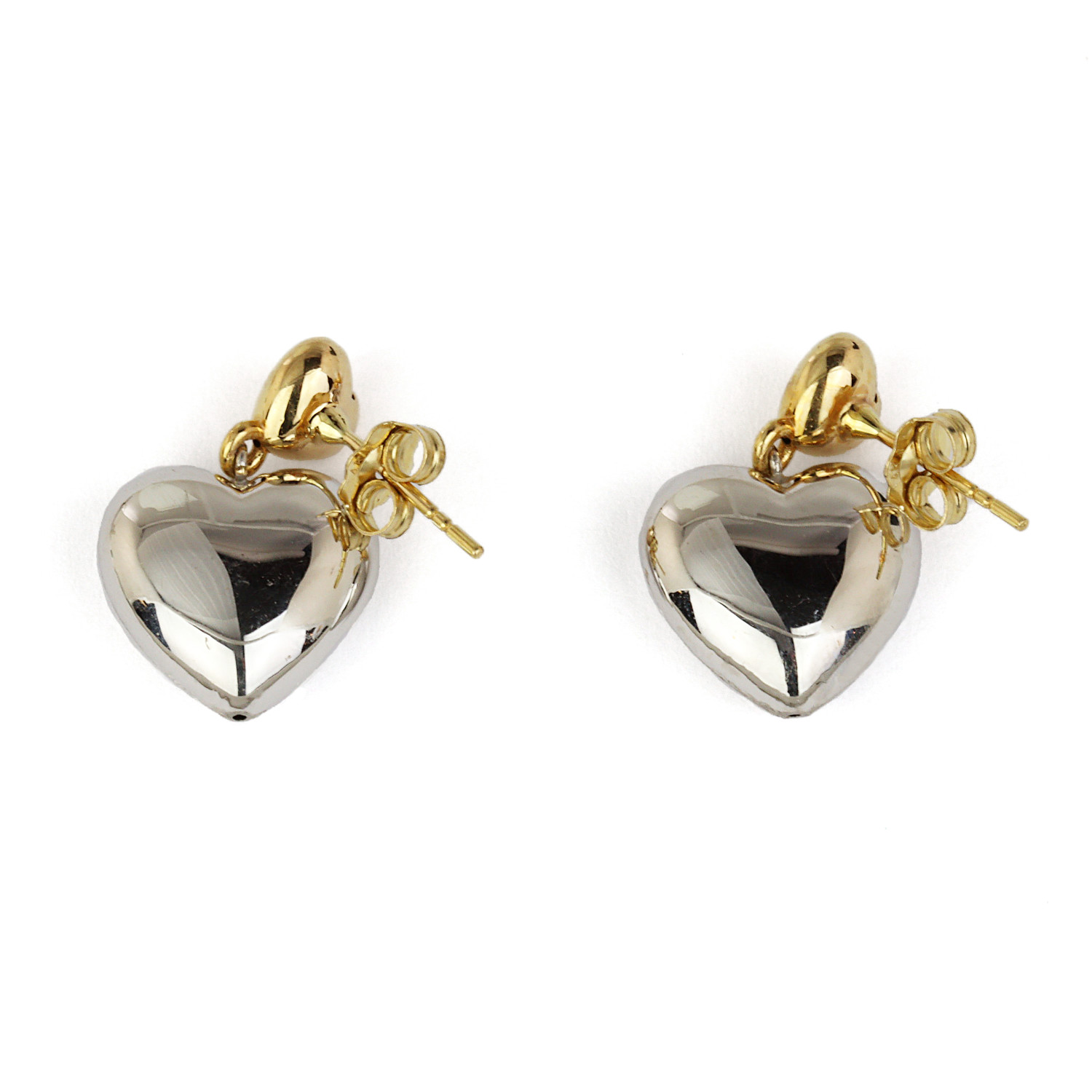 18k yellow and white gold dangle earrings. They measure 20mm tall, 13mm at the widest, and total weight is 1.8 grams. The backings are 14k gold.